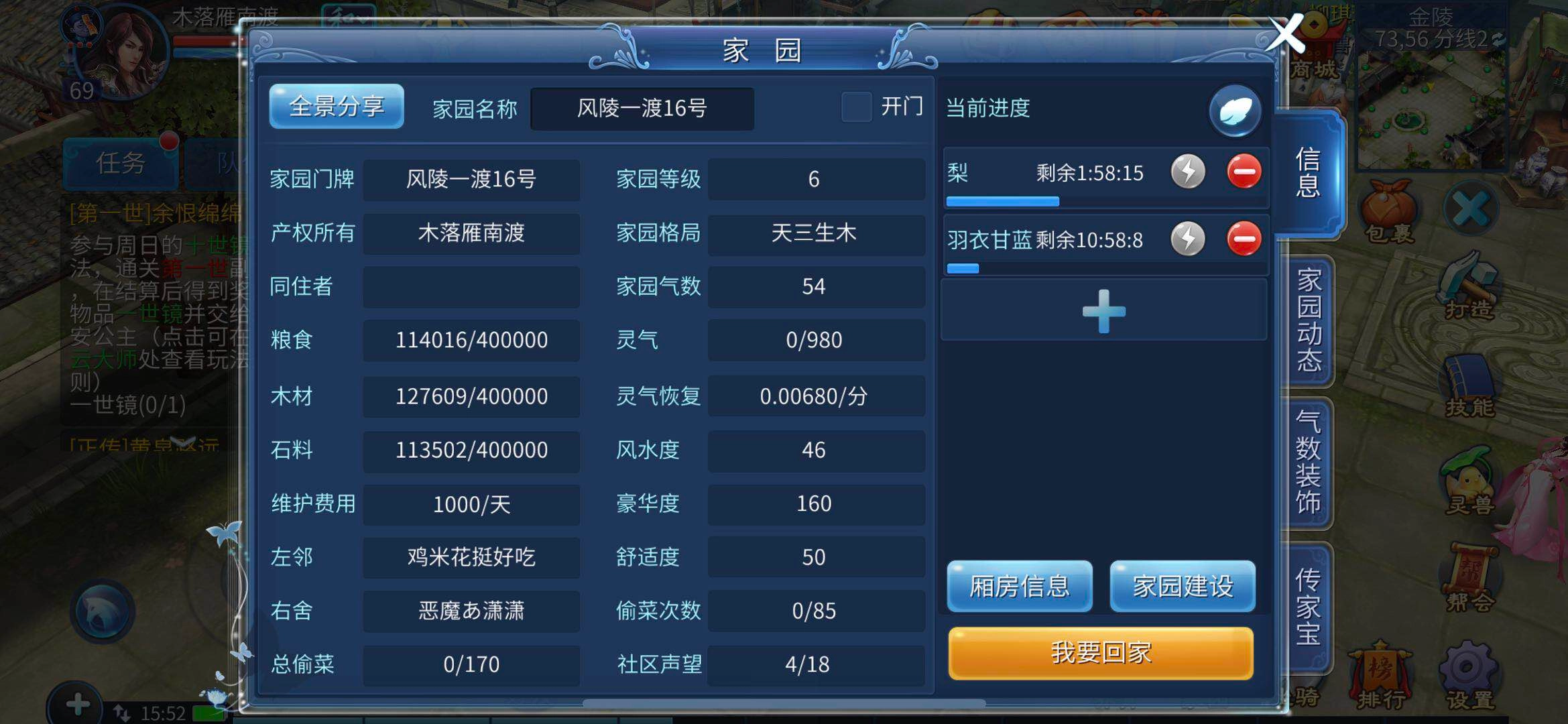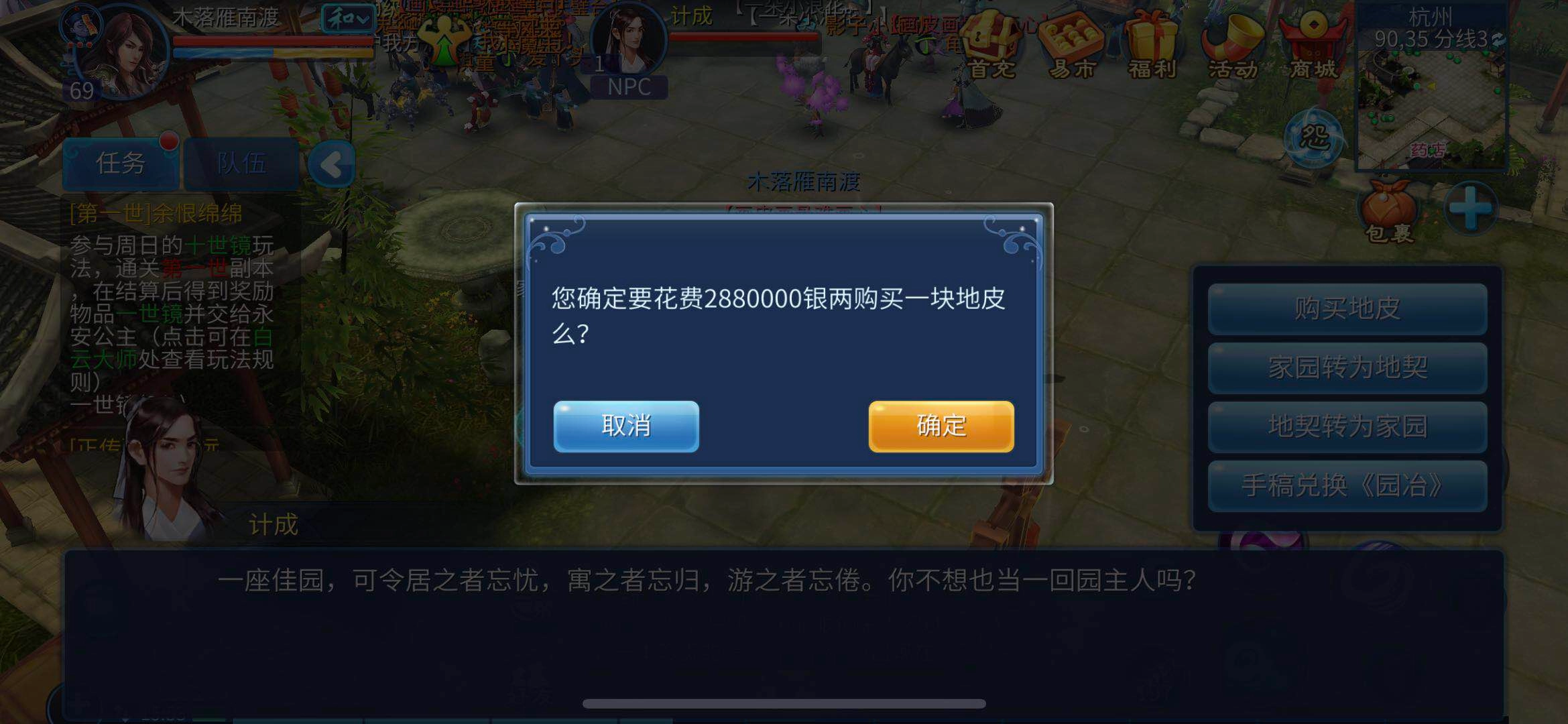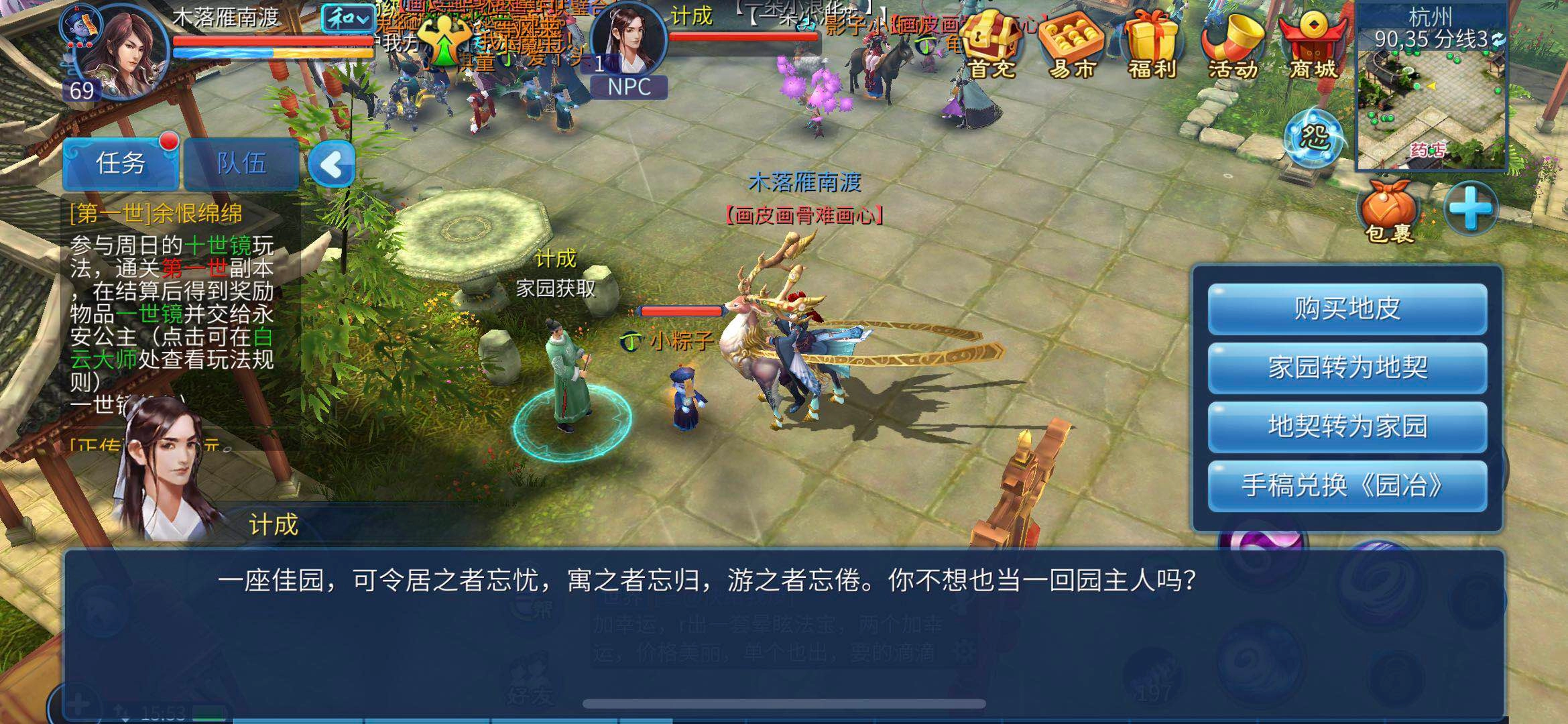 当玩家的等级与音量均满足要求后,便可前往杭州找到计成购买地皮。通过导航到达计成所在位置并点击他,会弹出对话界面,在界面顶部选择“购买地皮”选项,即可获得一个一级家园。家园到手后,玩家既能通过杭州的寻路NPC传送回家园,也能直接点击家园按钮返回。