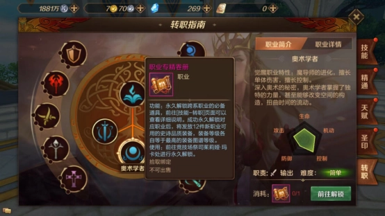 在转职界面中,能够看到通过消耗职务专精卷册这一物品,即可完成职业的解锁与更换操作。