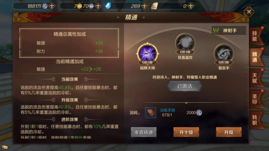 在精通界面,你可以挑选不同技能,通过消耗训练手册与银币来升级,升级方式有单次升级和十次升级两种选择。升级成功后,系统会展示升级前后的效果对比,其中逃脱的流血伤害技能会得到提升。