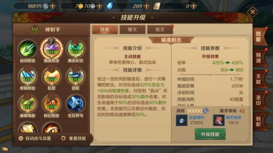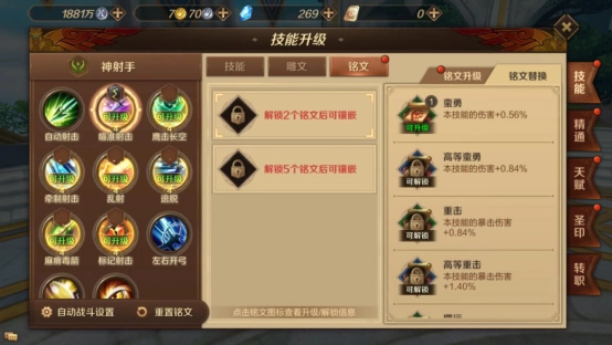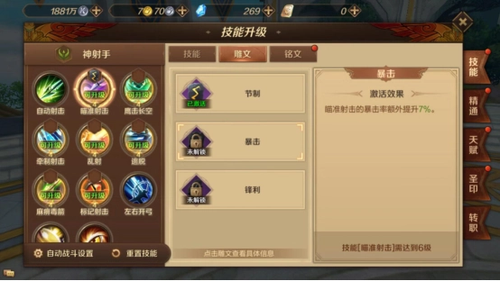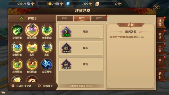 在雕文界面中,每个已选定的技能都会对应三种不同的雕文,每个雕文的右侧会展示其激活效果。举例来说,若选择瞄准射击属性,与之对应的雕文为节制、暴击和锋利三种;当选中节制雕文时,右侧便会显示该雕文的激活效果——瞄准射击的能量消耗减少5点。