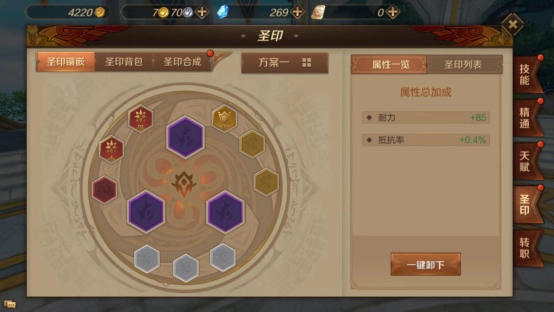 在圣印界面,能够把合成好的圣印镶嵌到对应的部位里,借助圣印的镶嵌可以提升当前角色的属性与技能。