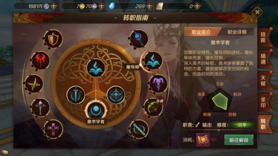 进入《万王之王3D》手游后,找到当前角色背包旁的菱形按钮并点击,即可查看该角色的各类信息。接着选择“技能”选项进入技能详情界面,这里包含技能、精通、天赋、圣印以及转职五个板块。
