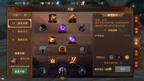在天赋界面中,玩家能够通过分配天赋点数来解锁或强化天赋技能,同时可以查看当前选定天赋能力的详细说明以及升级后带来的具体效果。完成天赋加点操作后,对应的天赋能力会得到相应的提升。
