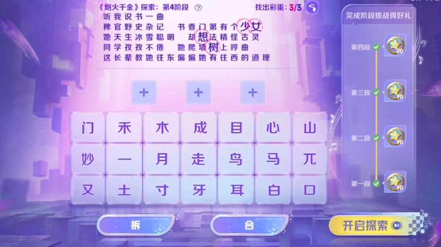 在游戏的第四阶段,玩家可以选择“妙”字并将其拆分,这样就能得到“少”和“女”两个字;接着把“木”“目”“心”这三个字合并,就能组合出“想”字;最后将“寸”“又”“木”三个字合在一起,就能合成“树”字。完成这些操作后,三个彩蛋就都被找出来了。