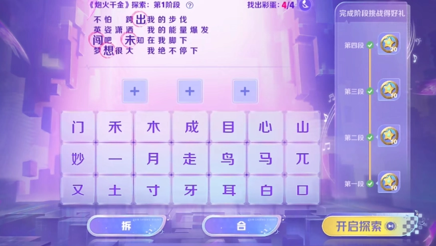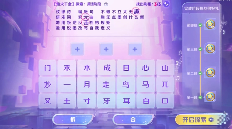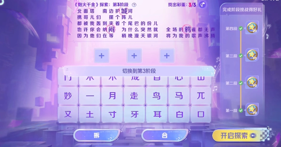 玩家只需完成这四个小关卡,就能获得对应的奖励,每个关卡的奖励仅能领取一次。具体玩法是:玩家要从给出的文字池里挑选两到三个字,通过合成或拆分的方式,拼凑出上方歌词里的文字,这样就能找到彩蛋了。