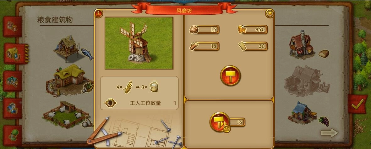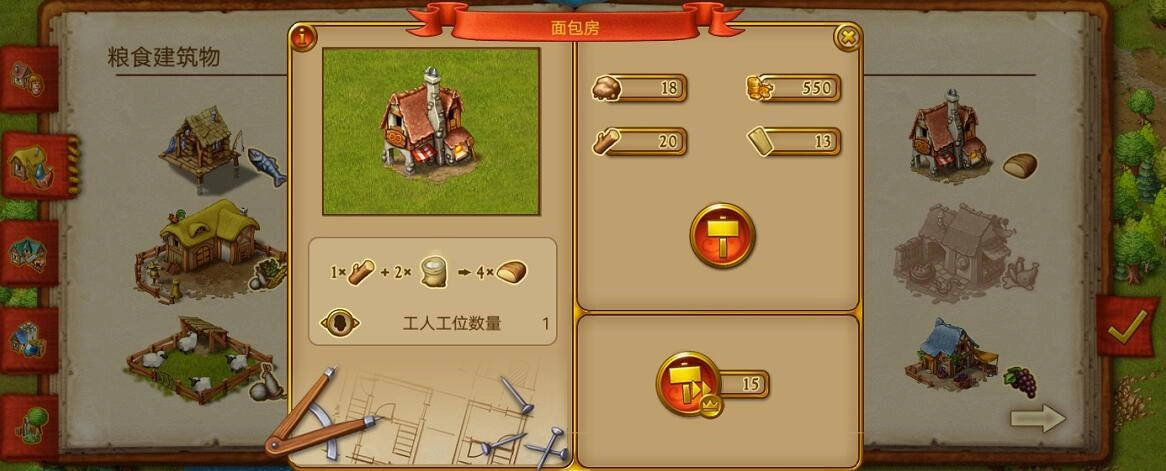 接下来是小麦坊,它的作用是把小麦研磨成粉末。面包店会用这些小麦粉制作面包,面包是居民非常喜爱的食物之一。不过,为了保证食物的多样性,还需要建造猪圈。猪可以把小麦当作饲料,通常一到两块肉就足够食用了,因此猪圈不需要建太多,有一两个就合适了。