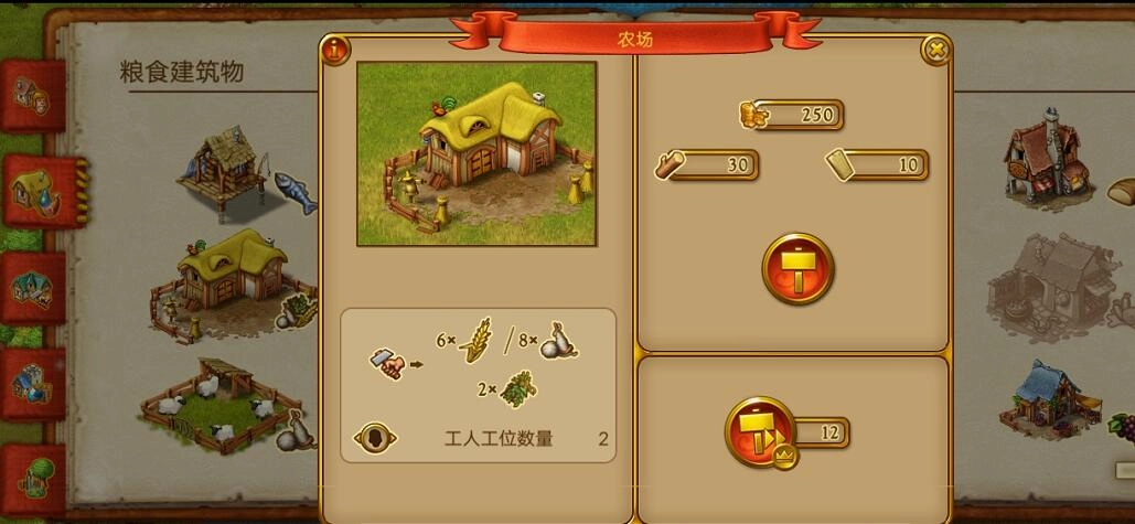 首先是衣,衣服相关有一条完整的产业链:玩家得先建牧场养羊获取丝线,再建布料小屋生产布匹,之后通过裁缝铺把布匹做成衣服。这条产业链适合集中在同一区域布局,别忘了配个仓库,这样各环节取用材料会更方便。皮革同样能做衣服,它来自养牛场,还可以用来制作盔甲。军事建筑里的兵工厂不需要建太多,集中放置能方便后续使用。