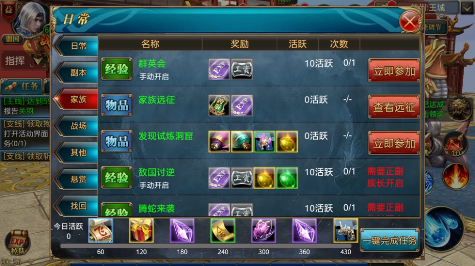 参与日常活动的操作很简单,只需点击主界面上方的按钮,就能看到日常活动入口。点击进入后,会发现里面有任务、副本等多种分类,这里建议大家优先去刷副本。