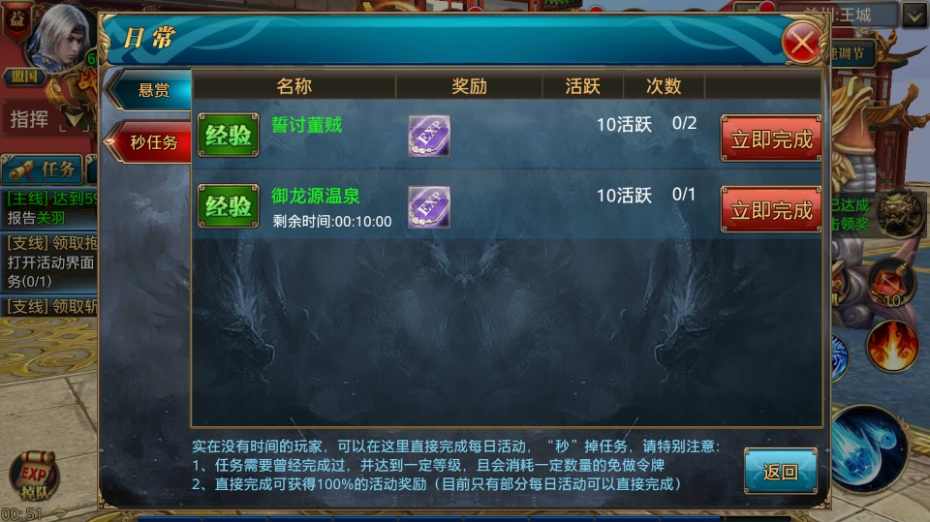 经验副本刷完我们基本就能到50级了,没到也没关系,去做日常任务就行。日常任务类型不少,点进对应的任务就能看到说明、介绍和奖励。