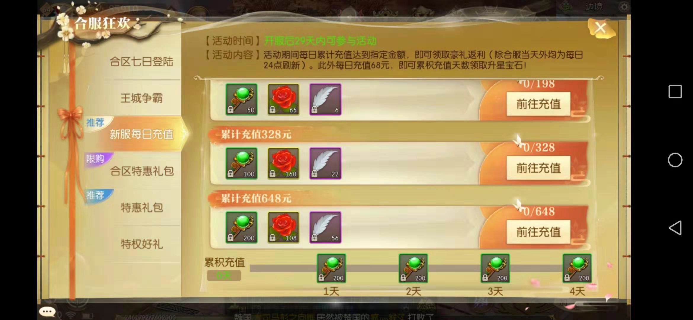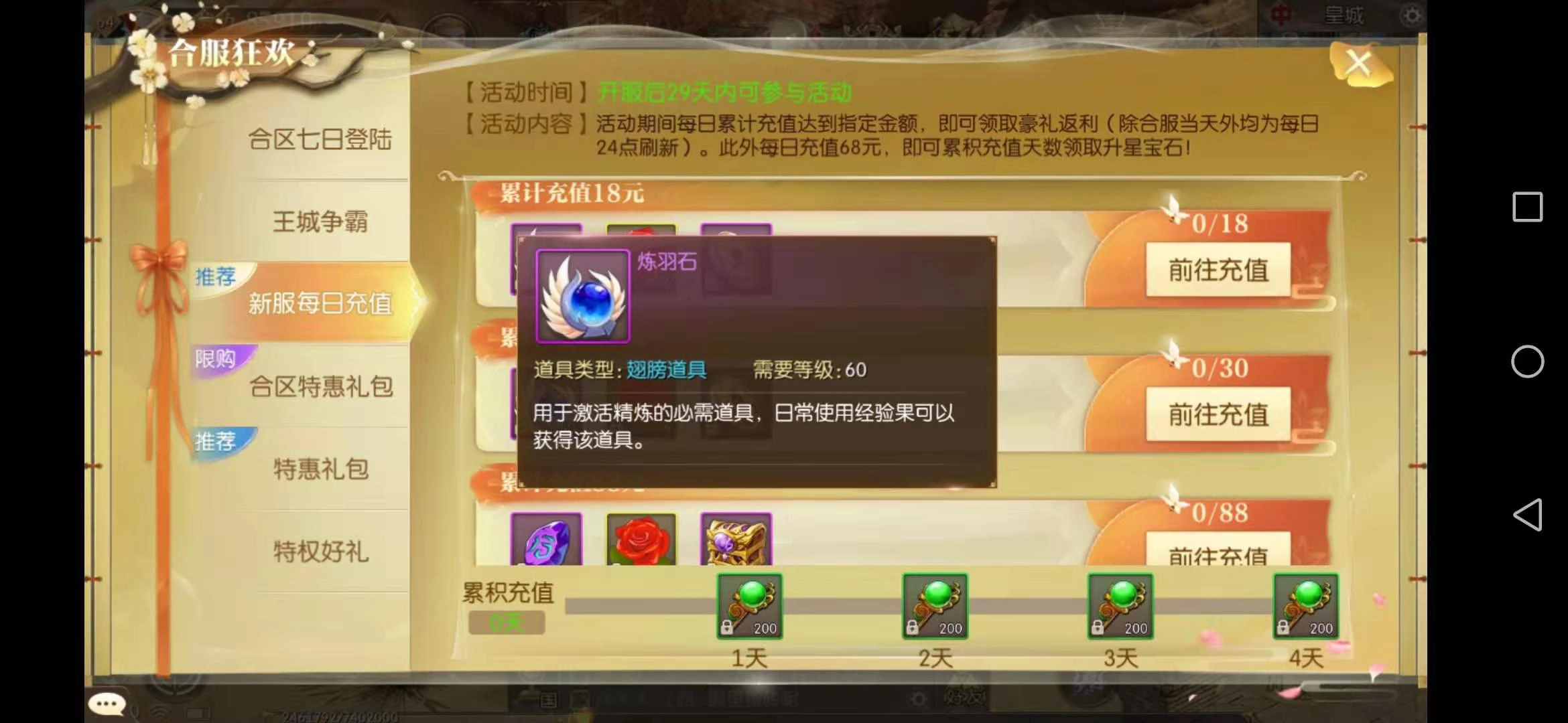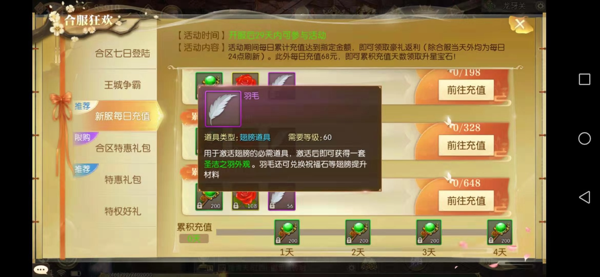 在新服的每日充值奖励活动里,只要完成一次首充,就能拿到3个羽毛,连续参与4天就能凑齐激活翅膀所需的羽毛数量啦。充值除了能领取羽毛,还能获得绑金、明元通宝和升星石等奖励,性价比很高,小编建议大家一定要把新服每日充值奖励都拿到手,这对在新服冲击排行榜会有很大帮助。