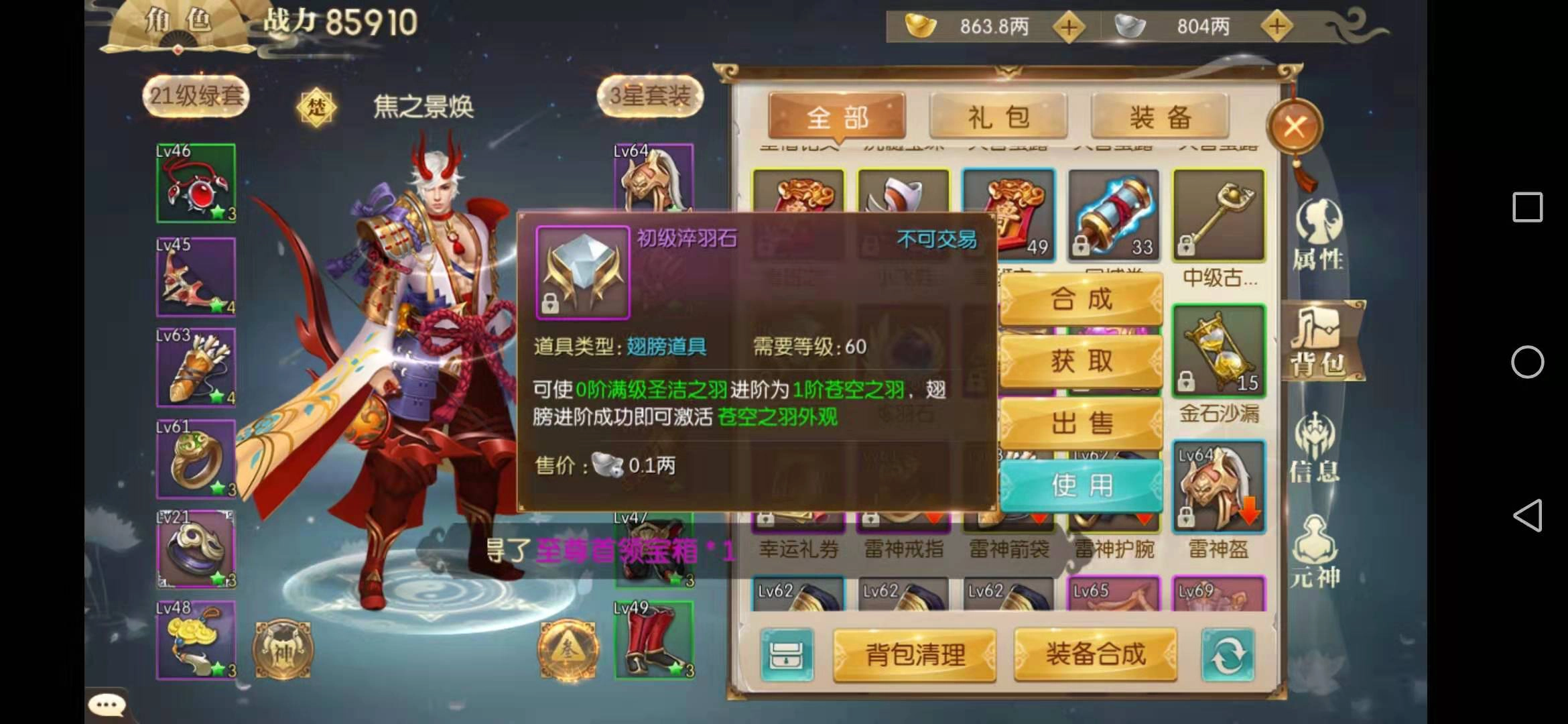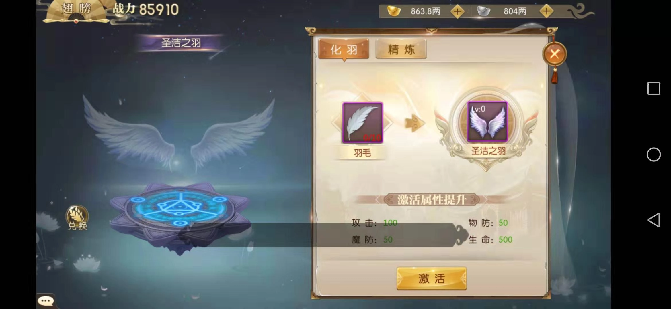 要强化翅膀,得先激活它。从界面能看到,激活翅膀需要用到羽毛这个道具,羽毛很稀有,获取途径有限,除了参加部分特殊的限时活动外,就只能通过充值购买礼包来得到了。
