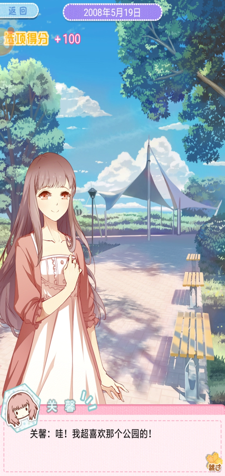 这一关卡的互动剧情里,林天会问关馨觉得公园之行是开心还是失望。玩游戏的时候,通常要选最不可能的选项,但这里如果选“失望”的话,会被扣掉100分。所以只要我们选择“开心”这个选项,就能在评分时额外获得100分。