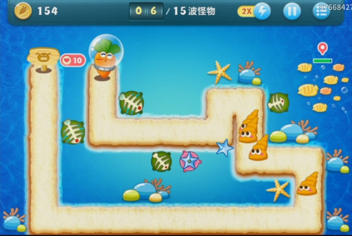 当瘦瘦的海星出现的时候,在出口的时候会受到第一个塔防的攻击,然后就是下面的鱼骨的攻击,最后在接近萝卜的时候被最后的一道防线消灭。