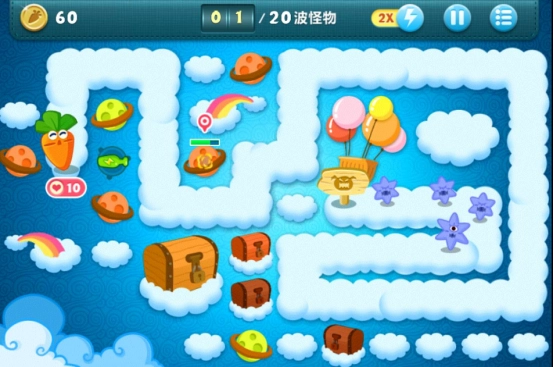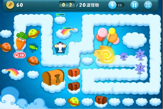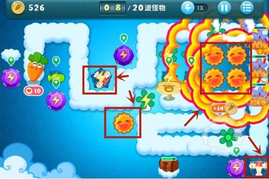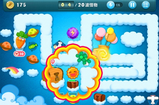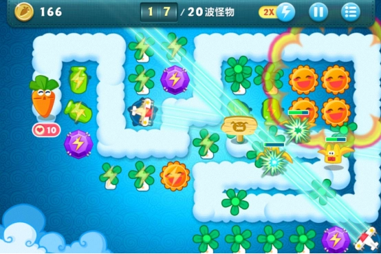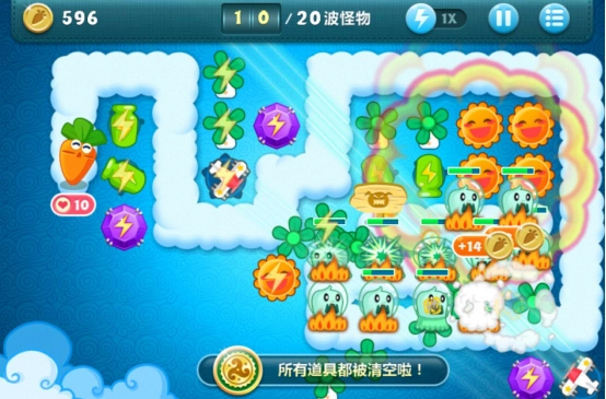 4、打到第十关前后,场上的道具差不多都该清理干净了。从这一关开始,击败怪物能获得的萝卜币会变得相当丰厚,建议先把已有的炮塔都升级到顶级,再在合适的位置摆放几个风扇。
