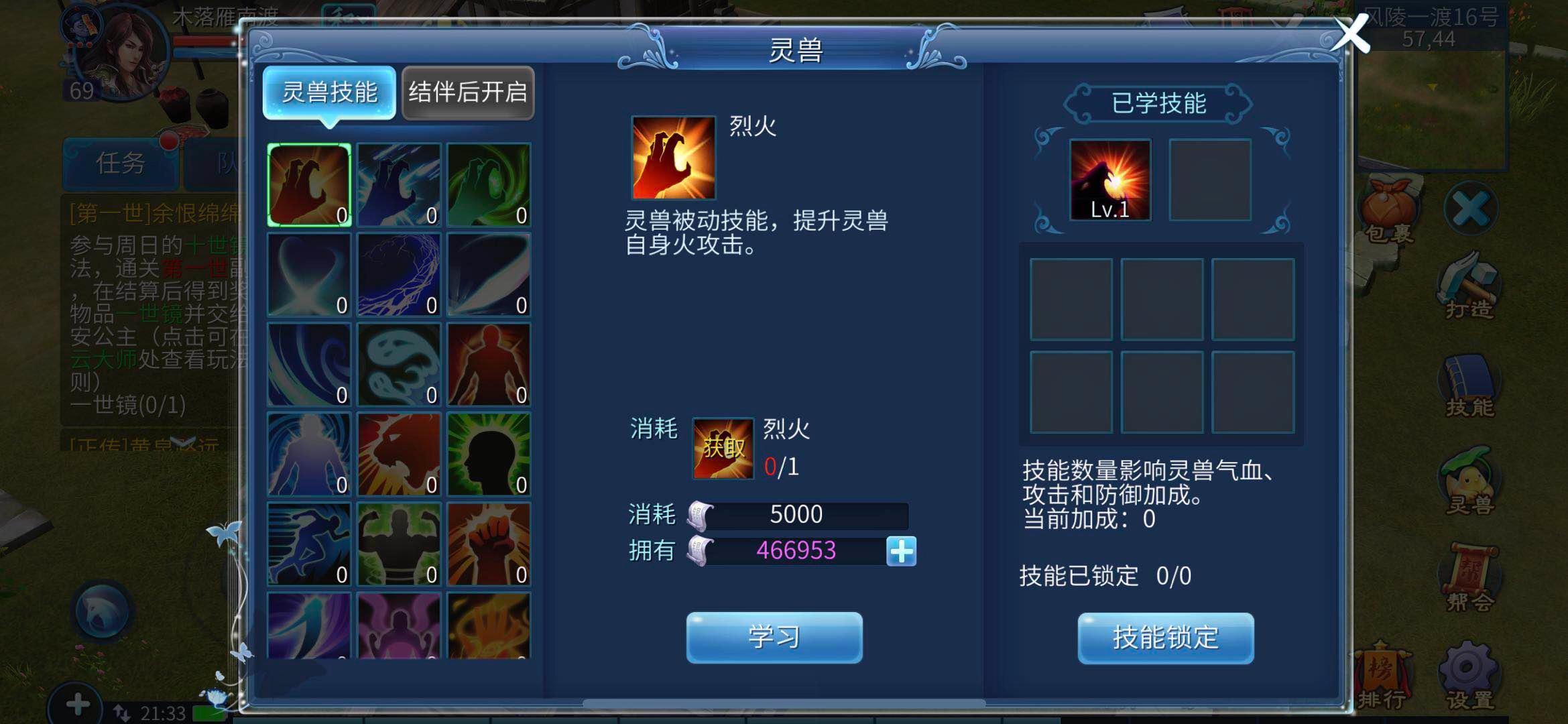 玩家的灵兽里,除了神兽之外,基本没有能在一级就获得宠物技能的。所以玩家得先给灵兽升级,开启第一个技能格子。通常情况下,当宠物达到五十级时,玩家就能让宠物拥有技能了,这些技能是宠物自己学习掌握的。而神宠在一级时就自带灭威类或固元类技能,到五十级会开启新的技能格子,届时就能学习新技能了。