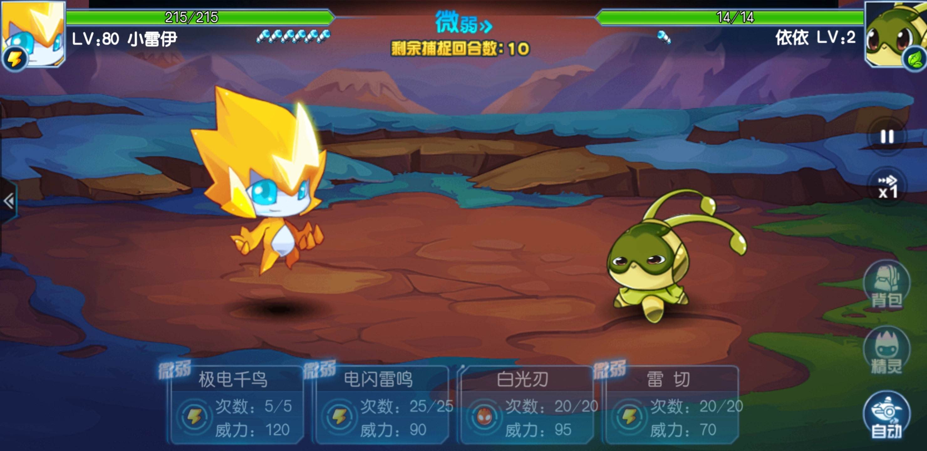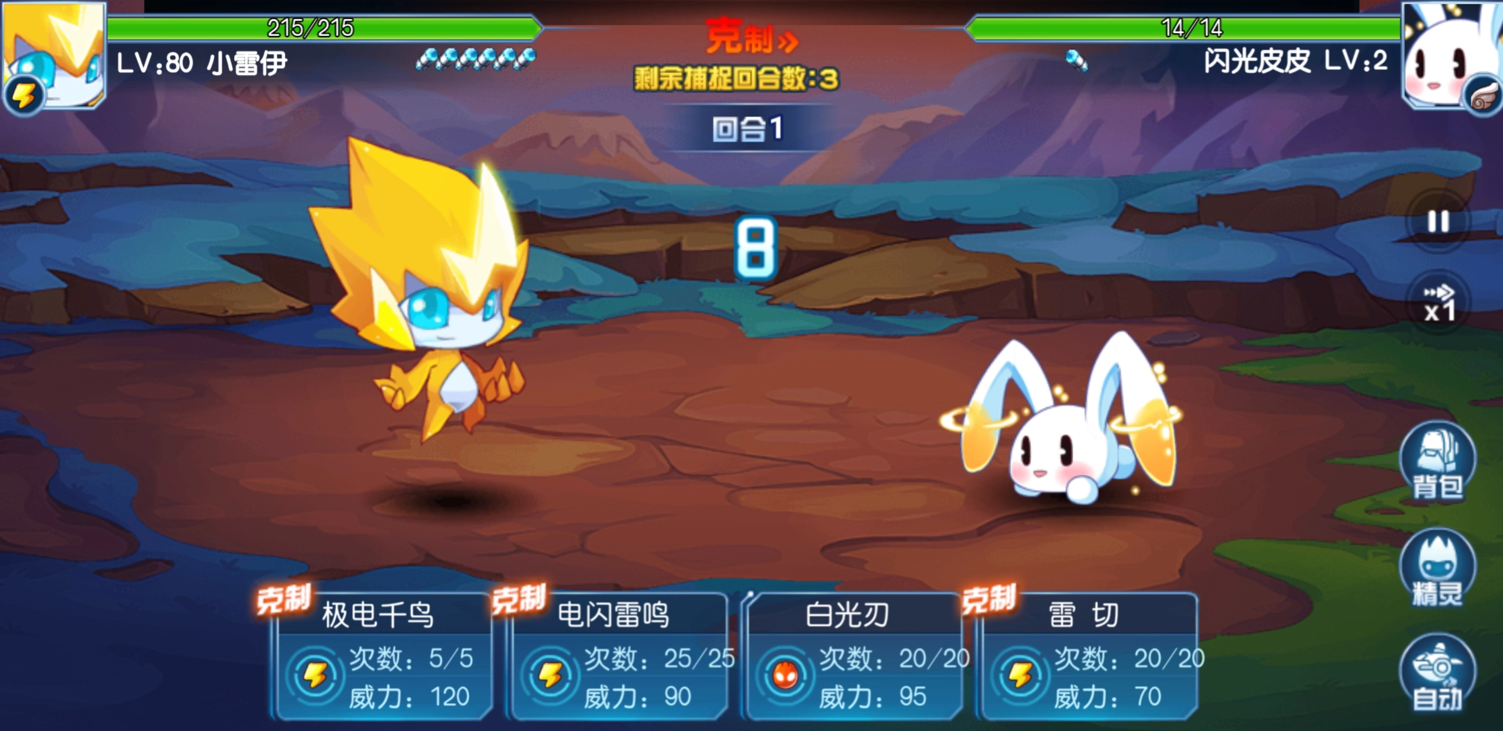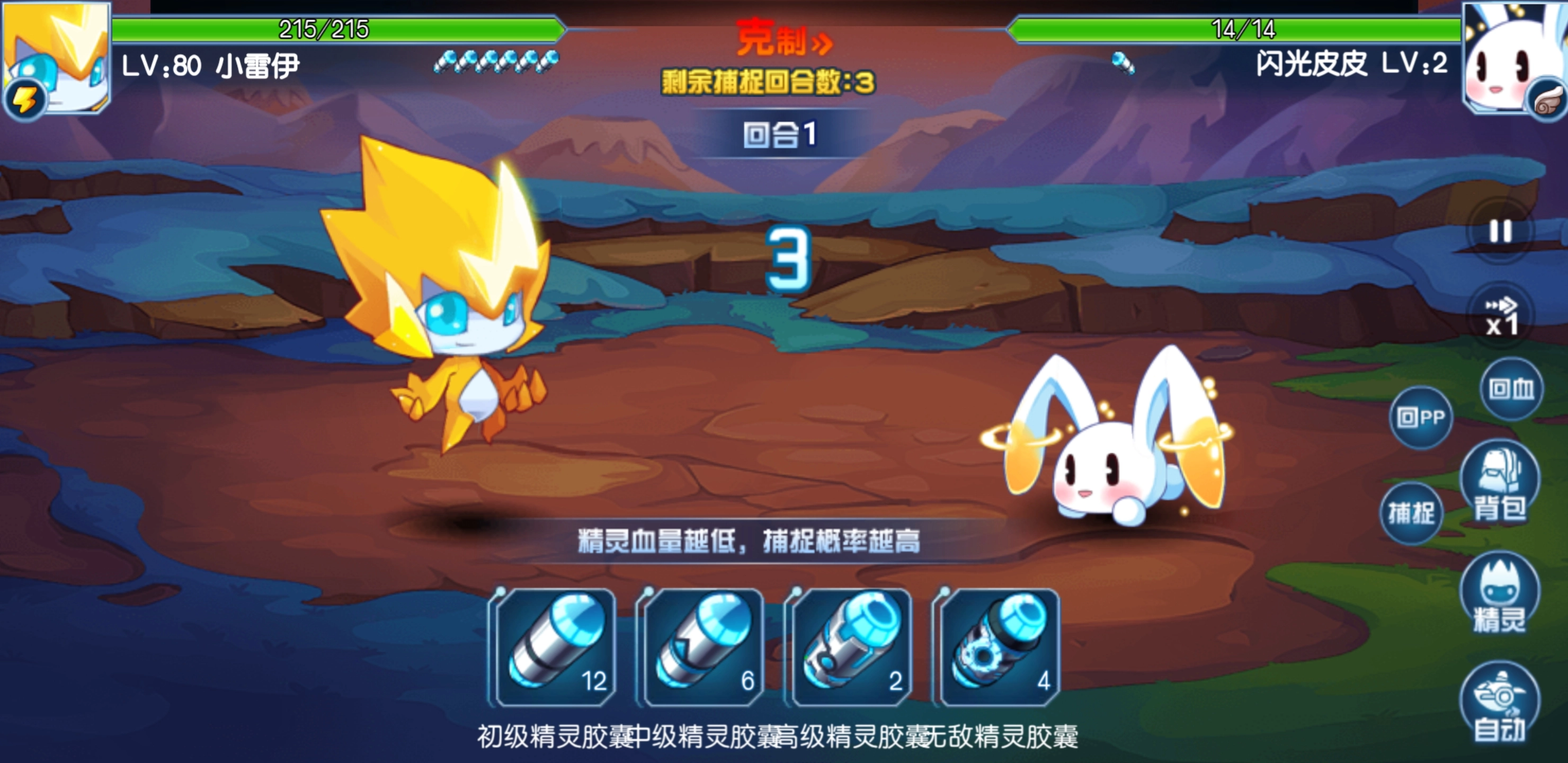 注意闪光皮皮作为稀有精灵,捕捉回合只有三个回合,所以玩家在第一回合削减闪光皮皮的血量之后第二回合立即进行捕捉。