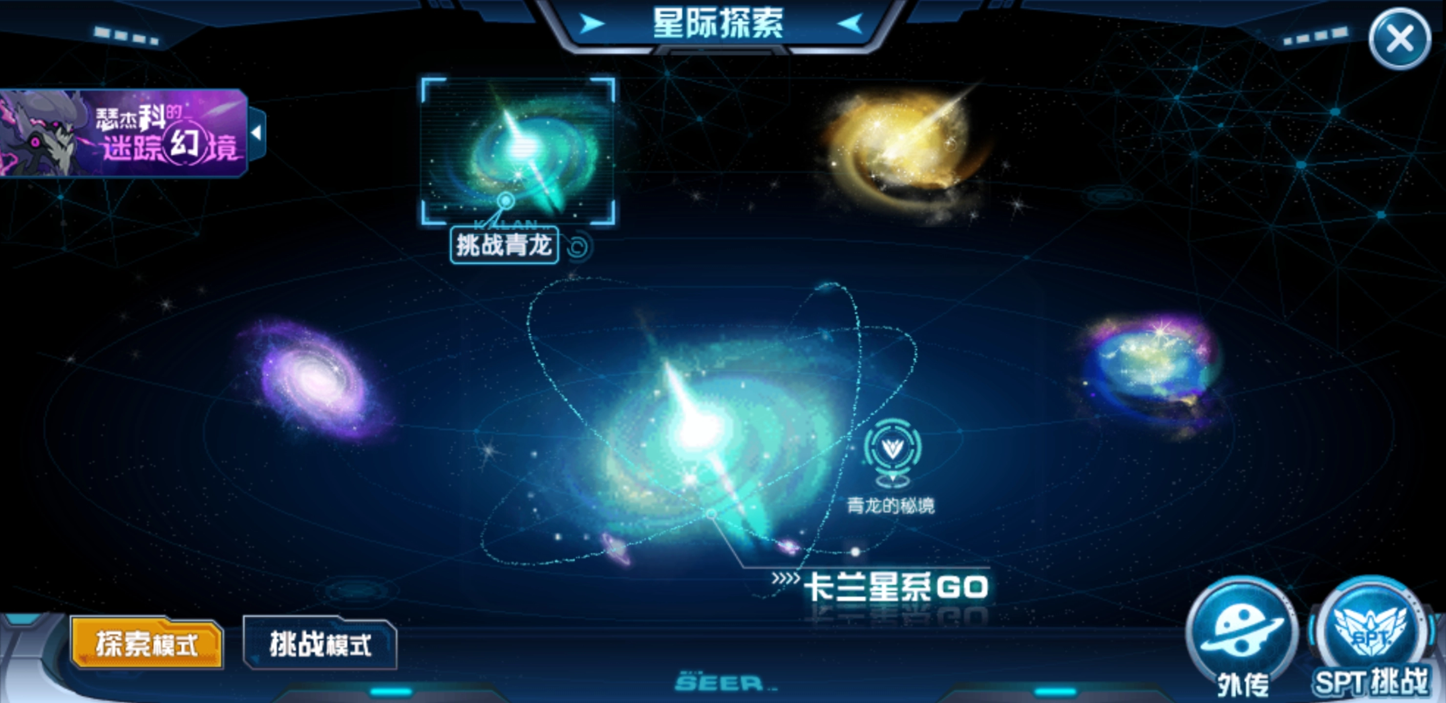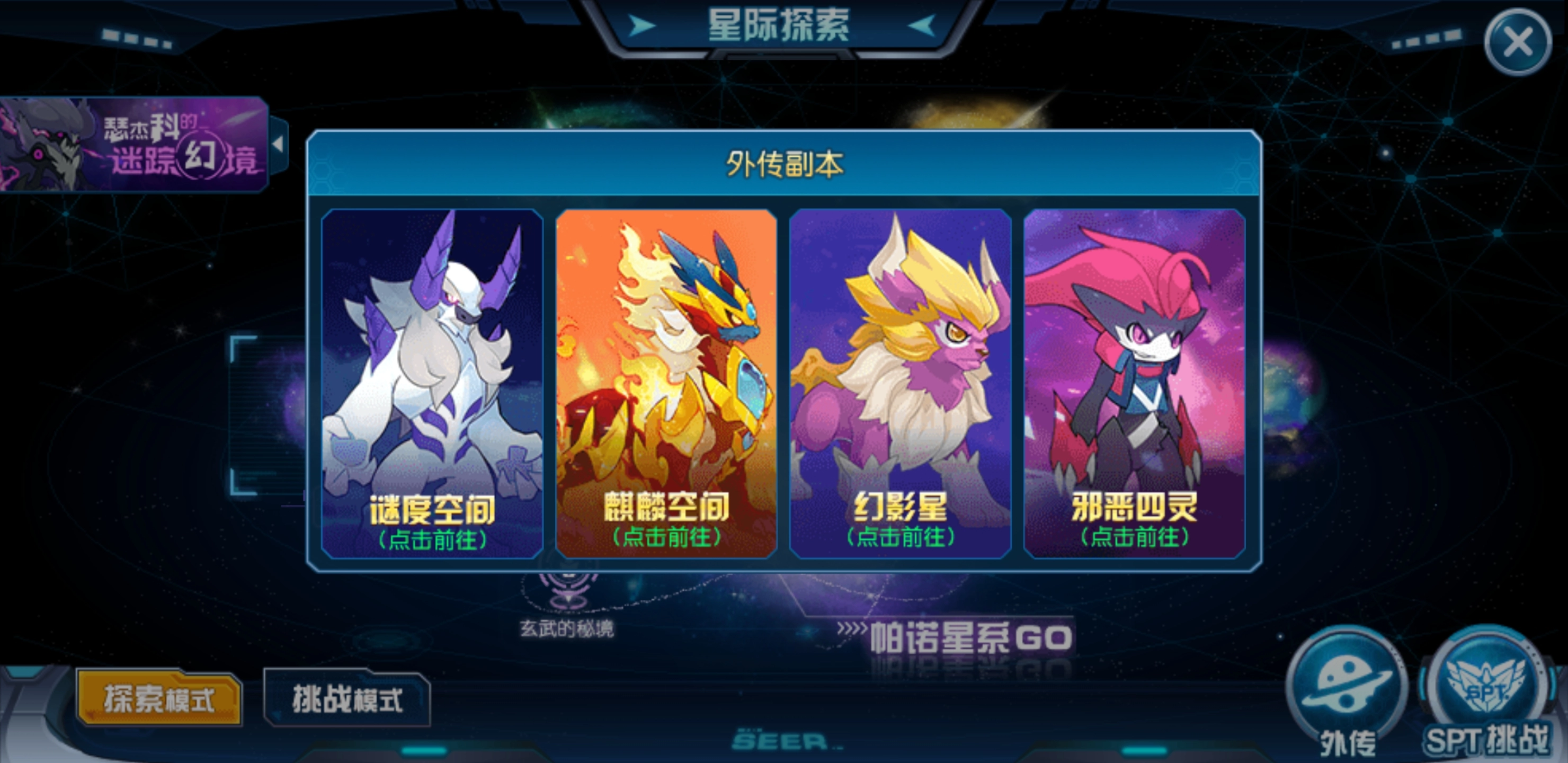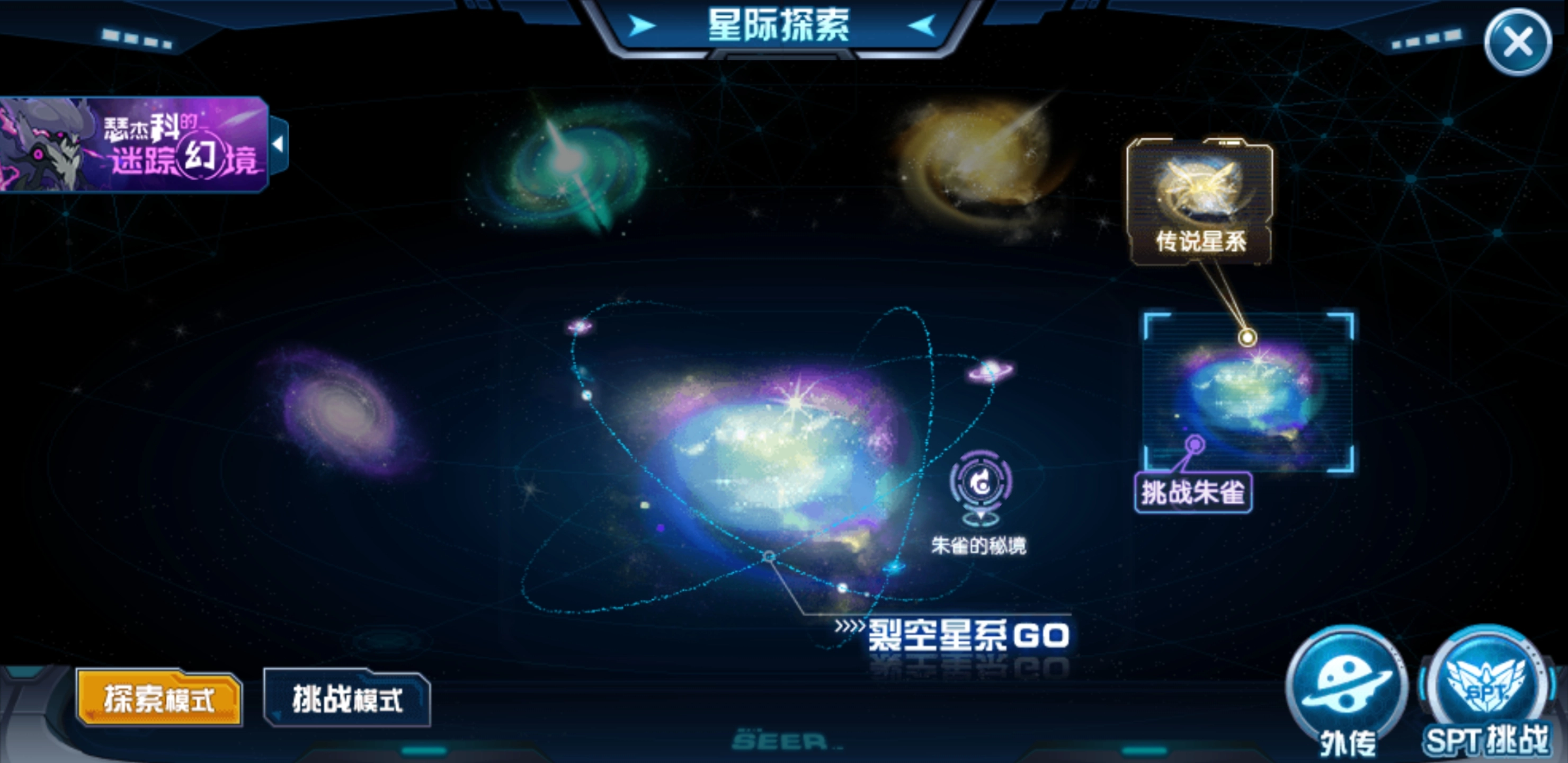 朱雀挑战对应的神兽来自裂空星系,玩家需要满足三个必要条件才能开启该挑战。此外,裂空星系中还有传说星系,玩家可在此挑战神圣谱尼,但同样需要达成挑战谱尼的必要条件。