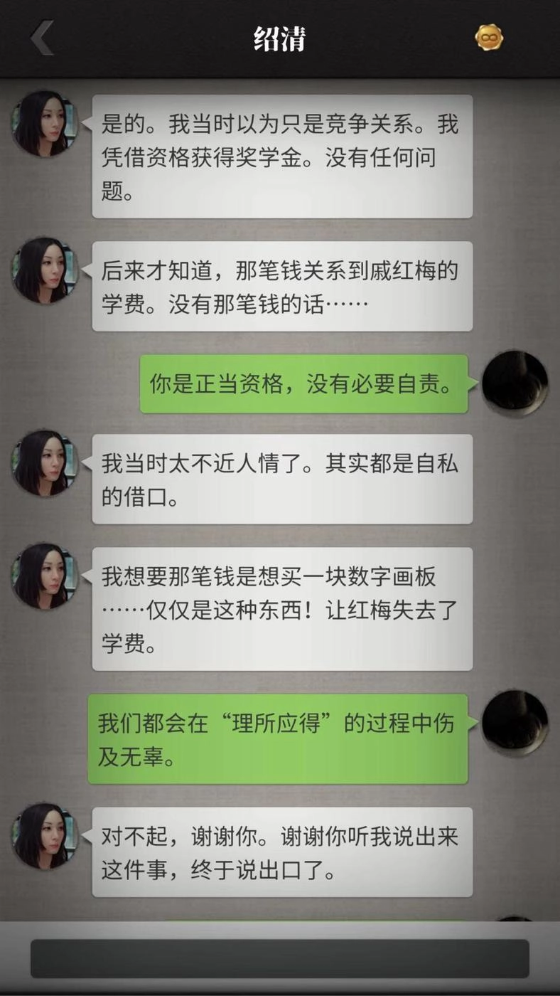 绍清:她支持红梅的创业项目并非单纯出于对红梅的支持,而是带有个人目的。在当初奖学金竞争时,她只认为两人是公平竞争,却没多考虑红梅因家境贫寒交不起学费的情况。所以,绍清是自私的,但这几年她一直对红梅心怀愧疚,也算是个尚有良心的人。