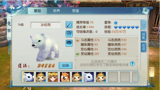 一个角色能够拥有多只宠物,一旦某只宠物投入战斗,其他宠物便无法同时出战。由于每只宠物的道法各有不同,玩家需要学会如何挑选合适的宠物一同出战。