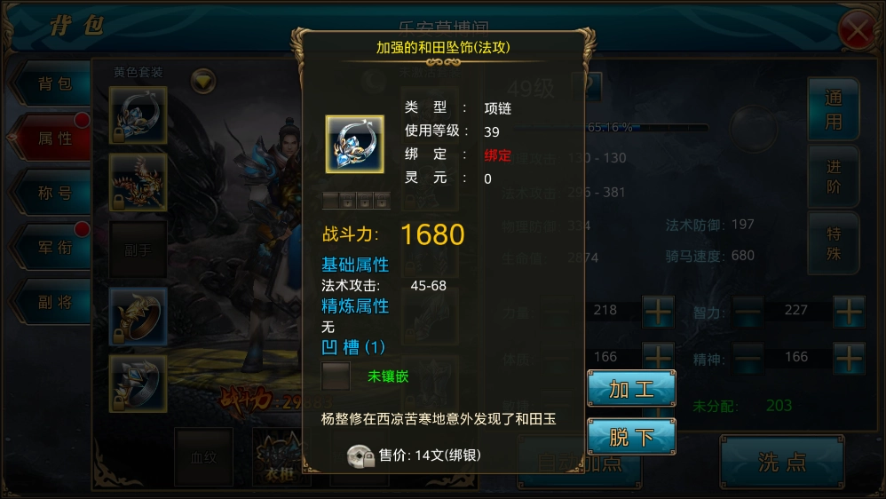拥有装备后,也别忘了对装备进行强化,还要给装备镶嵌对应的宝石。通常来说,血量宝石和智力宝石是扇子职业的主要选择。