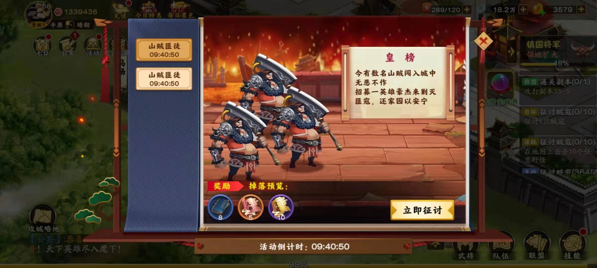 每次挑战橙色野怪都得用掉一枚高级征讨令,这道具相当宝贵,不管输赢都会消耗,因此必须谨慎挑选目标,选自己需要且能击败的对手出击。演武场的机制和打橙色野怪差不多,在主城的演武场里对战,每次演武能从现有武将里选人参战,打赢后也能拿到对应的武将洗髓丹,同样要消耗一枚高级征讨令。