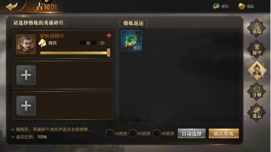 在古镜馆里熔炼其他高级碎片,得到的信物会严格按照古镜馆的定价,这样就能用这些信物购买更多英雄碎片了。