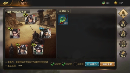 我们先看看隐退相关的场景设定——古镜馆系统并非游戏初期就解锁的内容,得等城主等级提升到特定阶段才能开启!和其他游戏不同的是,在《九州缥缈录》手游里,英雄进行隐退操作后,培养该英雄时消耗的材料乃至经验都会百分百返还,这一点特别便捷。而且英雄隐退之后,还会有额外的惊喜等着大家呢!