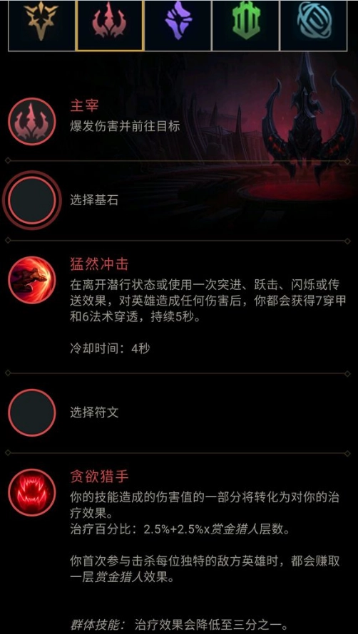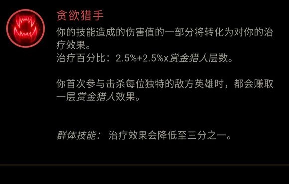 剩下的那个就是贪欲猎手了,我觉得这会是目前为止最被低估的几个天赋之一。先讲个逻辑,不知道大家能不能理解:在对拼的时候,你回复了多少血量,就相当于你变得有多肉,因为对手需要额外打掉你恢复的这些血量。能不能明白这个点,直接关系到对这个天赋的认知。记得第一次带贪欲猎手的时候,中后期随便看了一眼,真的吓了一跳——这个天赋居然已经回了2000多血。后来仔细研究了一下,发现刀妹的Q技能是单体伤害,而且对小兵还有伤害加成。