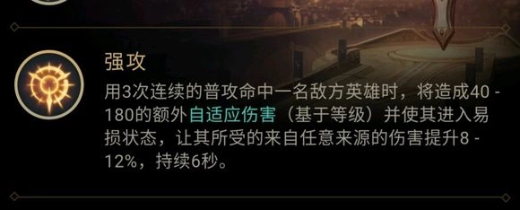 最近发现,其实前期在线上硬拼时强攻这个符文效果更猛。有一局对线诺克萨斯之手,我带了强攻试了试,3级对拼把他击杀后看了眼面板,强攻居然打出了60多的伤害,确实挺可观的。虽然征服者在中后期通常会比强攻更强,但在线上对抗时真的感觉强攻更凶悍。所以我觉得,当对面阵容里脆皮英雄比较多的时候,推荐选择强攻这个符文。