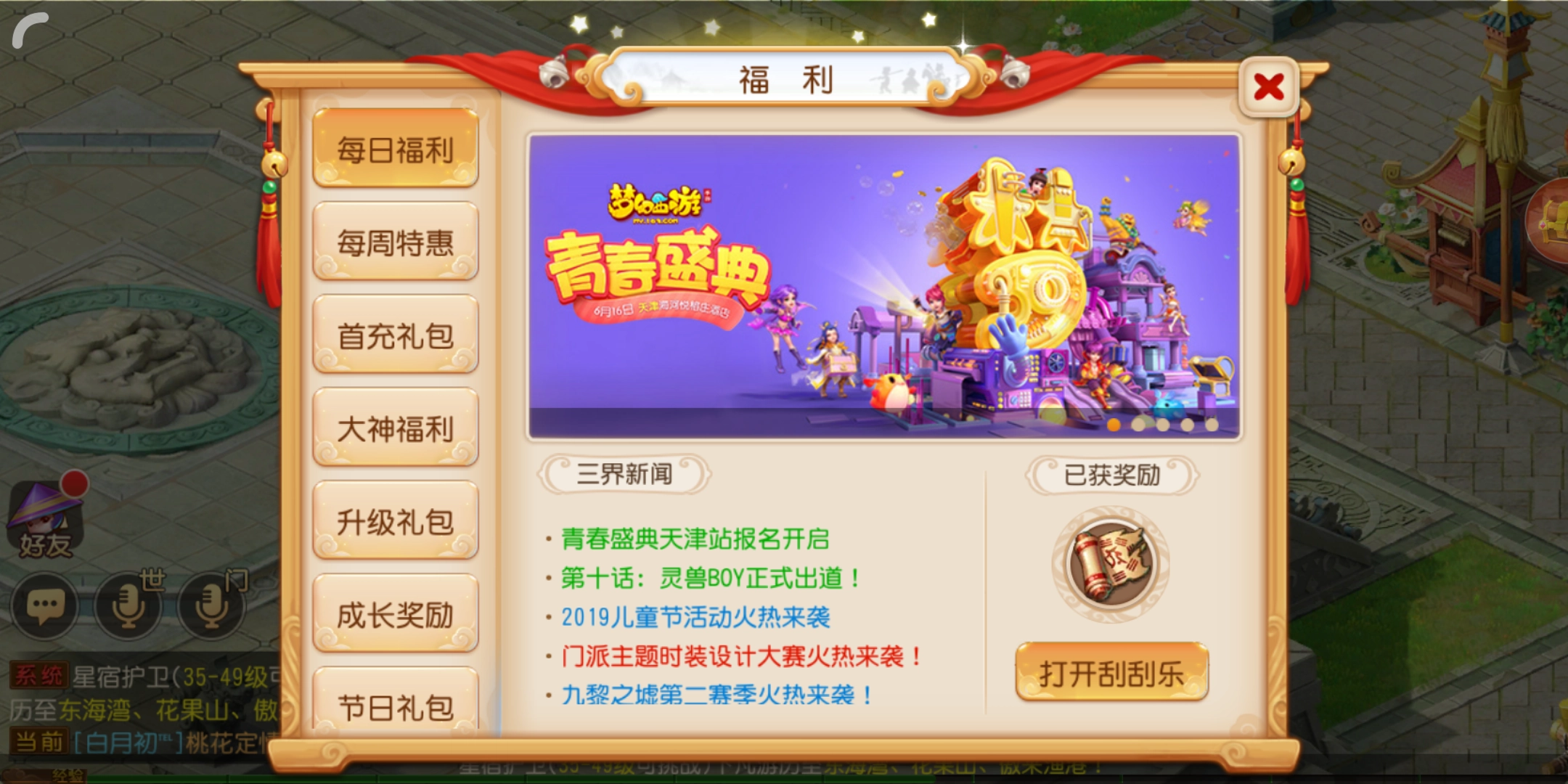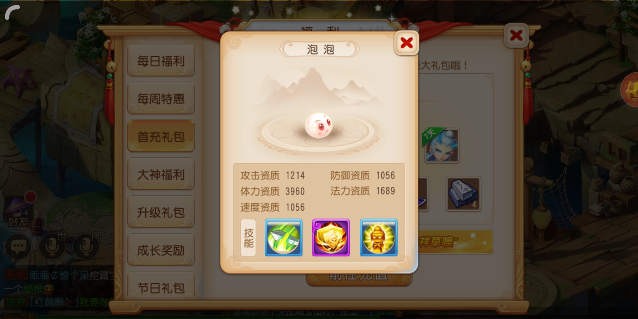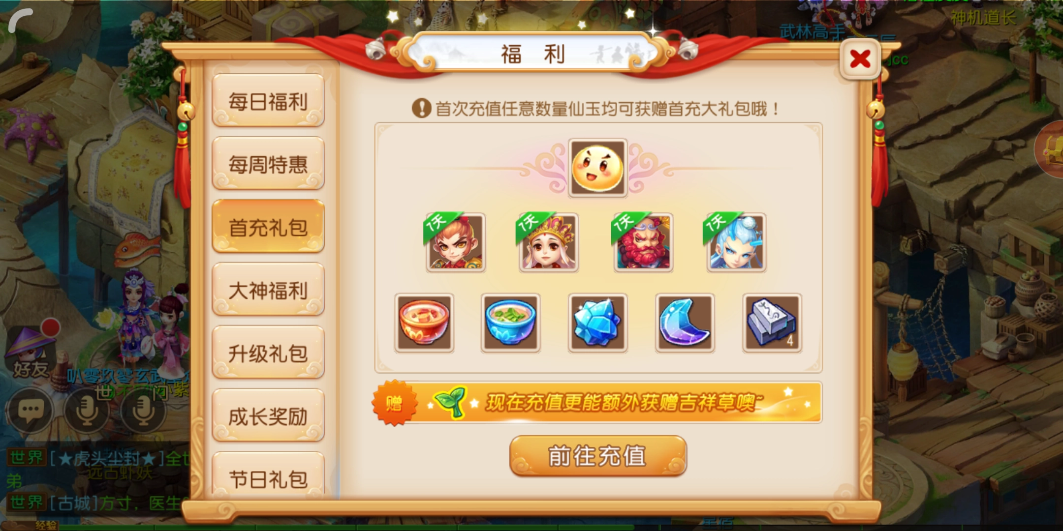 只要充值任意金额的仙玉,就能领取首充礼包,这个礼包需要在主页面左上角的福利入口中打开领取。