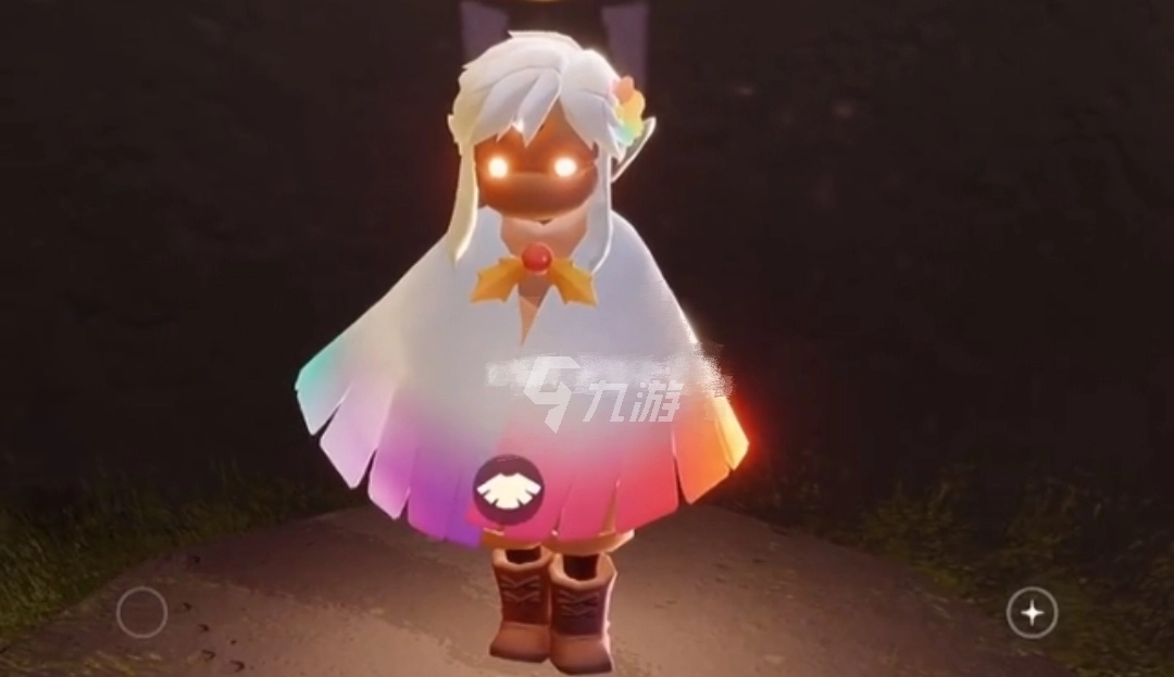 现在我用的是单色尾迹魔法,彩虹尾迹魔法则带有彩色效果,使用后尾迹会呈现出五颜六色的样子,还能随彩虹的色彩变化。需要注意的是,彩虹尾迹魔法的颜色无法叠加,要是你和小伙伴分别使用不同的彩虹尾迹魔法,你们就能组成一支彩虹小分队啦。(这里温馨提醒一下,彩虹尾迹魔法在禁阁地图里效果会更明显哦)解锁前置节点后会获得彩虹斗篷,解锁它需要175根白蜡烛,这款斗篷的配色是上半部分为天青色,下半部分是彩虹的颜色,背后还有彩虹形状的图标。另外,商店里还售卖一顶彩虹帽子,售价68元。下面就是我的上身效果展示图。