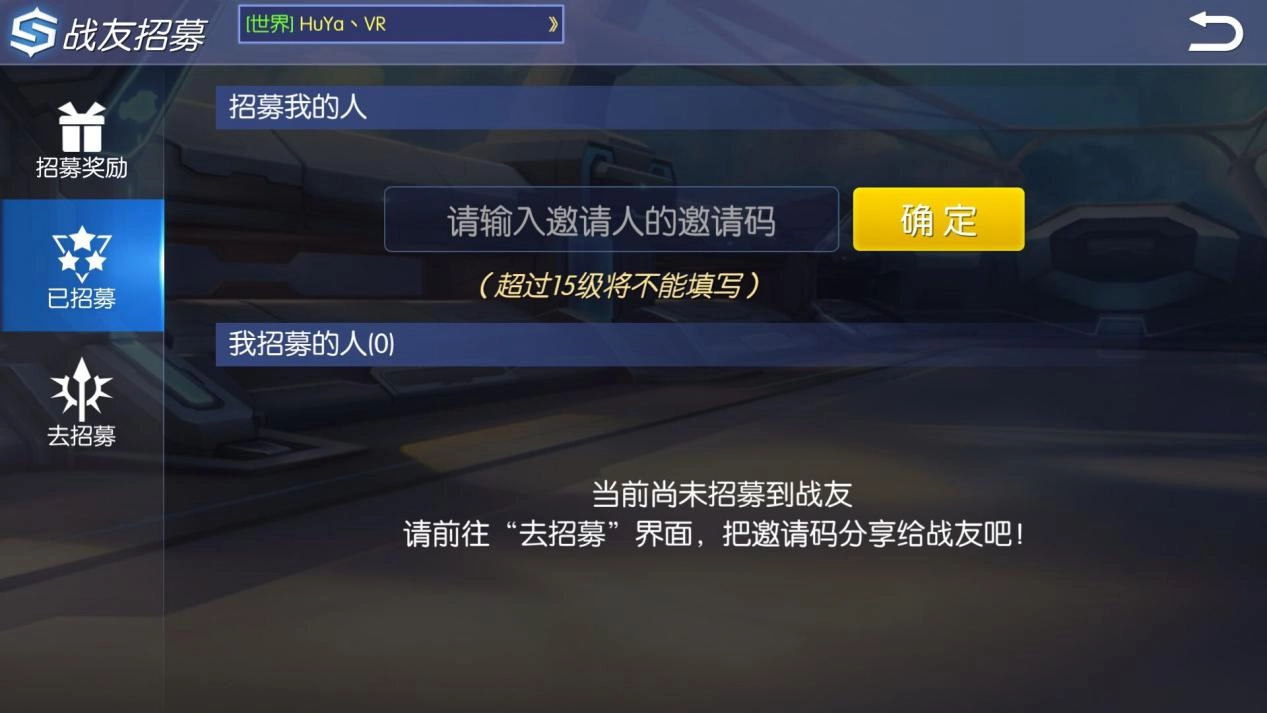 这其实就是输入招募码的流程。招募码在“已招募”界面里,这个界面分两部分,上面那部分就是用来输入招募码的区域。要是你的等级还没到十五级,就能在这里填写别人的招募码,这样你就会被对方招募,成为对方的招募战友了。
