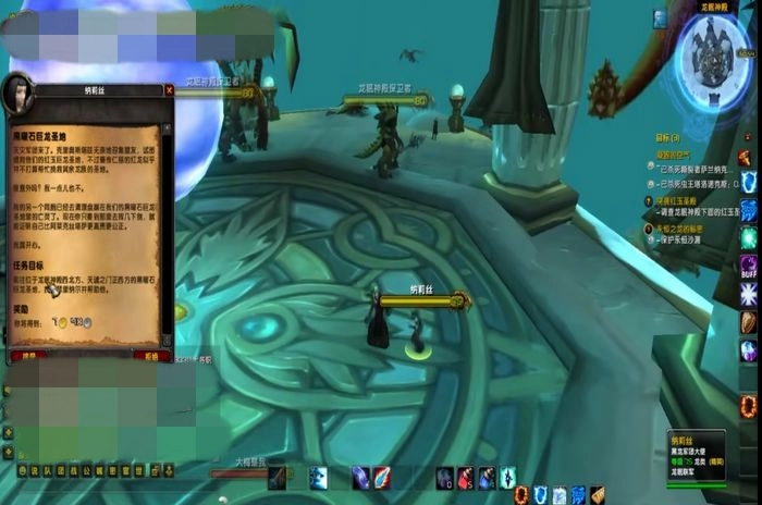 首先前往地图上的龙眠神殿,这个地方地处诺森德的中心区域,是魔兽世界里主要阵营龙族的聚居之处。先在塔下如图所示的位置找到NPC,接取开启声望的任务,之后再前往塔顶寻找三位龙族代表。