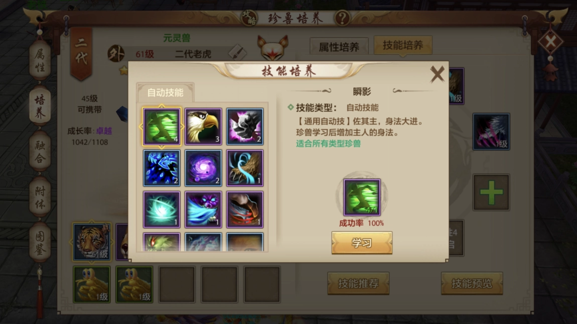 珍兽学习技能有多种获取途径:一是在商会用银元宝购买;二是完成分金定穴任务后,使用普通藏宝图挖宝十次,即可获得兽决宝匣,其中包含一个珍兽技能要诀;三是直接挖普通藏宝图,有机会随机得到。