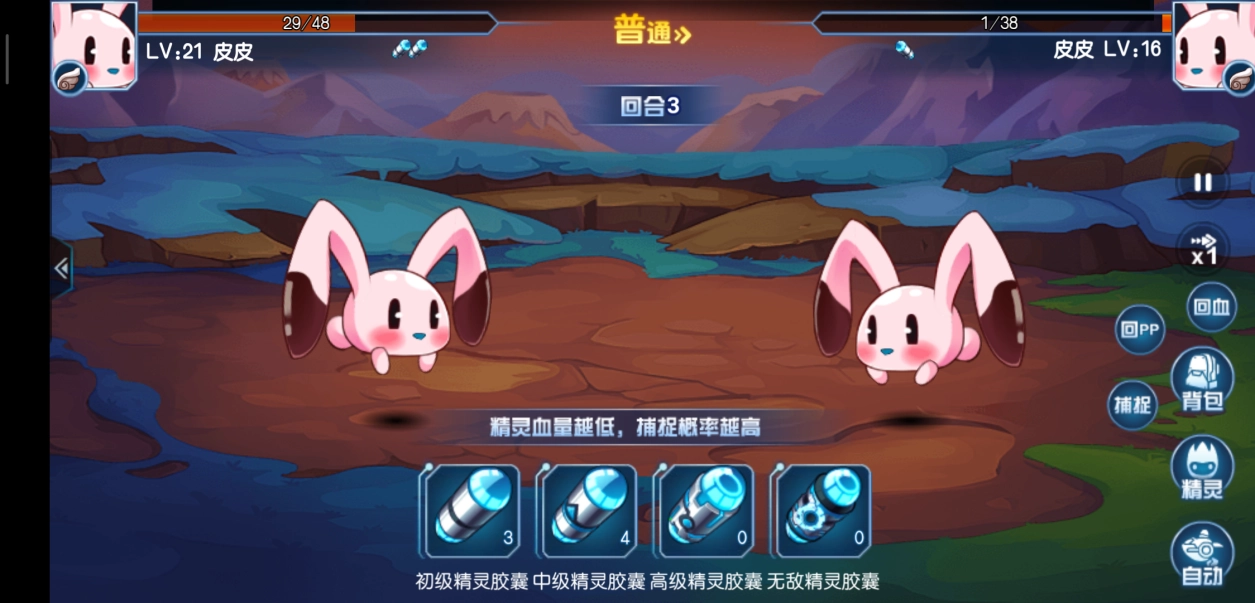 当轮到我们行动的回合时,我们可以打开背包选择捕捉功能,捕捉野生精灵得使用胶囊。胶囊的品质有高有低,对应的捕捉概率也不一样,挑选性价比相对最高的胶囊,这本身也是一种游戏里的智慧与策略体现。