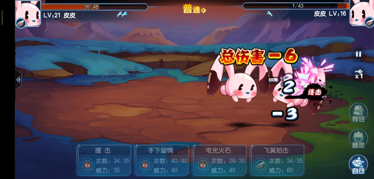 点击地面上活动的野生精灵,即可进入如上图呈现的战斗界面,此时我们拥有的精灵便会自动出战。每只精灵配备四个技能,当我们点击战斗技能后,精灵会依据自身攻击速度的快慢来确定出招的先后次序,战斗采用回合制模式,双方交替进行攻击。