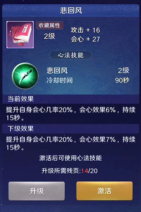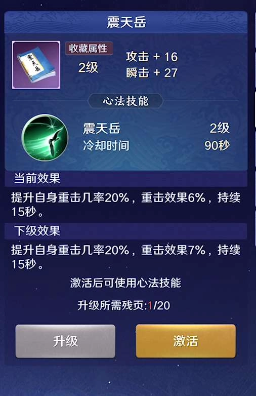 4、震天岳:使自身重击几率提高20%,同时附加6%的额外重击效果,该状态持续15秒。