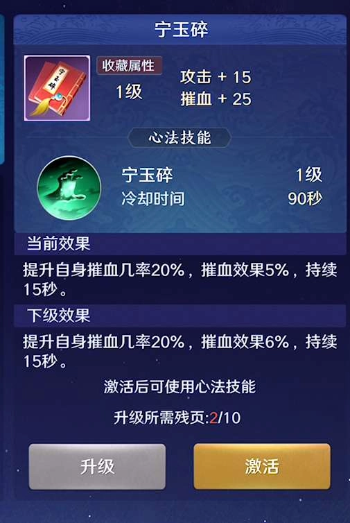 3、宁玉碎:自身催血几率提高20%,对目标施放催血技能时效果增强5%,持续时间为15秒。