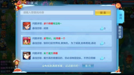 当有玩家回复您的问答时,系统会及时发出提示。玩家只需打开问答板块的“我的记录”界面,点击自己发布的提问,就能查看其他玩家的回复内容。之后,选择一位您认可的玩家添加为好友,并申请加入他所在的帮派,即可完成拜师流程。