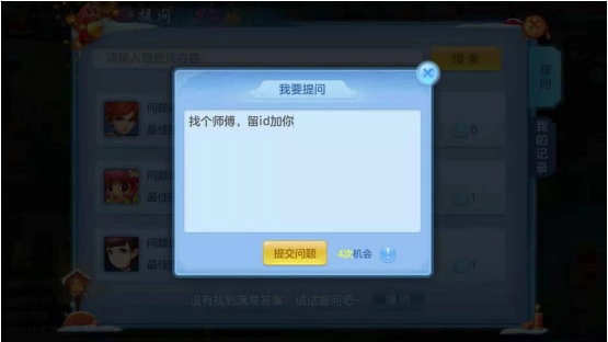 在《神武3》手游里,并没有专门负责拜师事宜的NPC,因此玩家得自行去寻找师傅。这里给大家分享一个小技巧——借助游戏内置的问答系统来找师傅。具体操作是:点击界面上方的“问答”按钮,随意搜索一个问题后,在页面下方就会出现“提问”的选项。