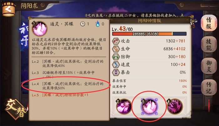 最后一个位置可以选拉条式神,但要是己方椒图的速度足够稳定,更建议上阎魔。这个副本的第三关有五个桃花妖,她们不仅能互相回血,就算秒掉其中一个,也会立刻被复活,确实很棘手。因此我们可以借助阎魔的被动效果,阻止对方触发复活机制,这样就能快速通关了。