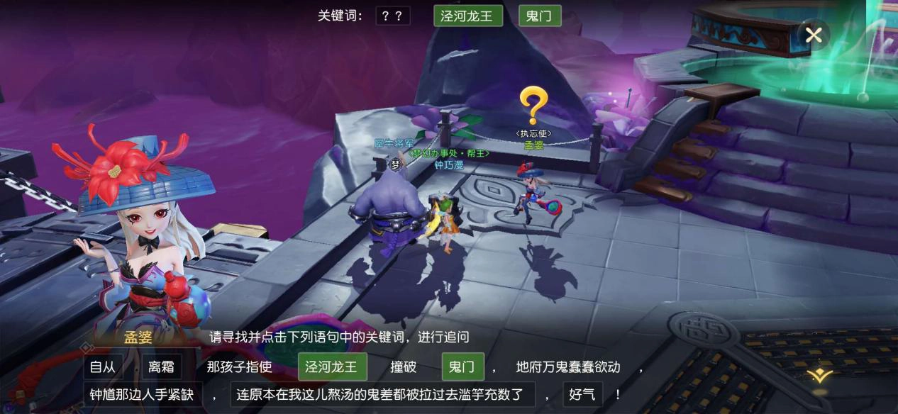 第三步,给其他鬼魂喝下孟婆汤后,挑选泾河龙王、鬼门和离霜这三个关键词进行对话,之后去找崔判官,再向阎王说明情况。这里的对话选择要谨慎,正确顺序是“判官确实去修复了”“刚刚发现”“忙于度化长安亡魂”,务必不要选错,否则会引发严重后果。