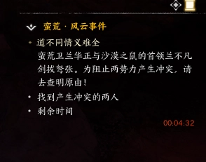 任务详情:蛮荒之地的卫兰华与沙漠之鼠的首领兰不凡此刻局势紧张,剑拔弩张。为避免这两方势力爆发冲突,请前去探寻事情的缘由!