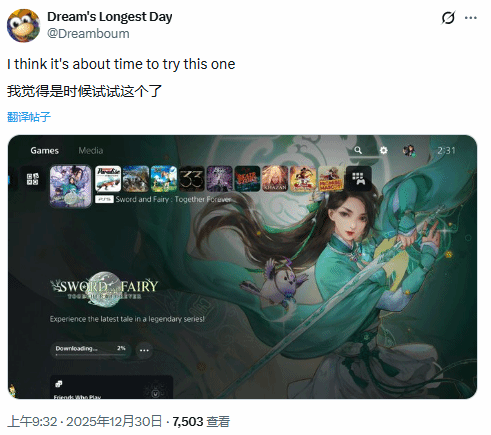 当外界都以为他会继续“开炮”发声时,这位博主今天却晒出了一张PS5的下载界面截图,截图里清晰显示着该系列的最新正传作品《仙剑奇侠传七》。