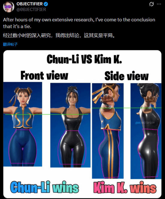 他很快便得出了结论。0BJECTIFIER指出,从正面视角评判,春丽占据优势;而从侧面视角来看,金·卡戴珊仅以几个像素的微弱差距胜出——换言之,这场评比最终其实是平局。