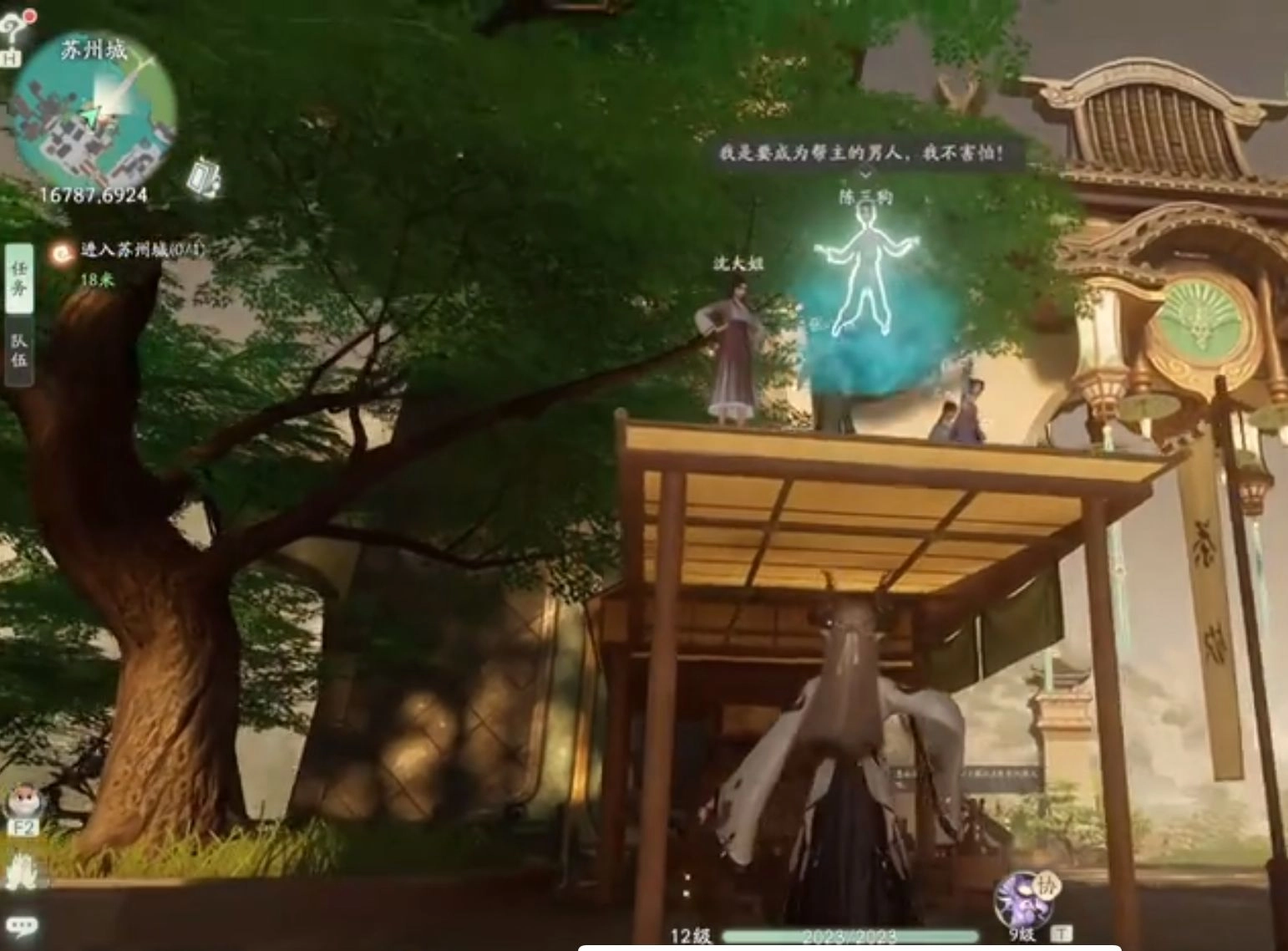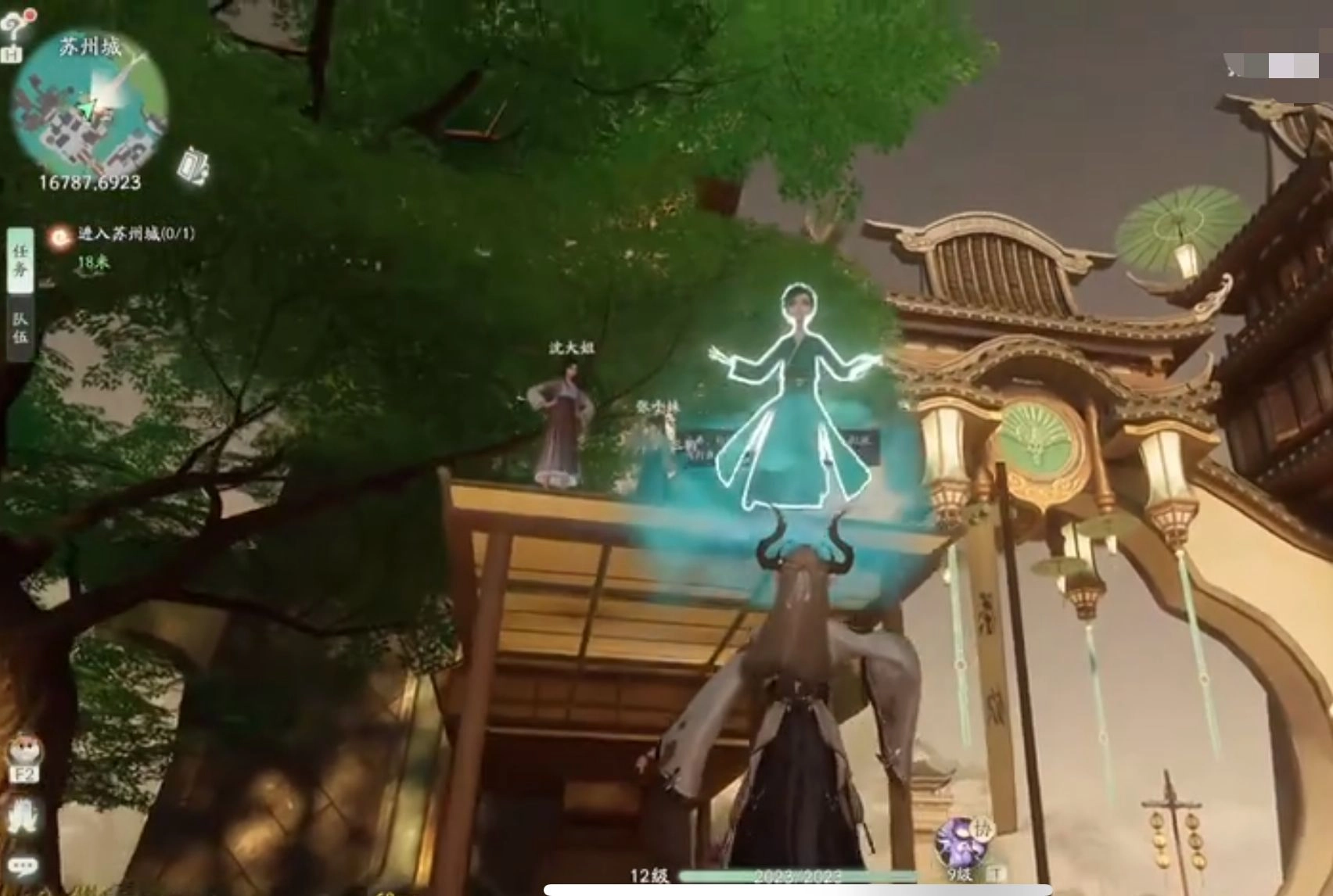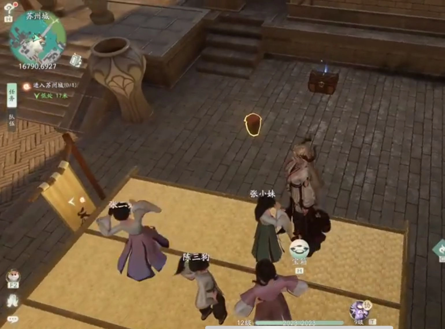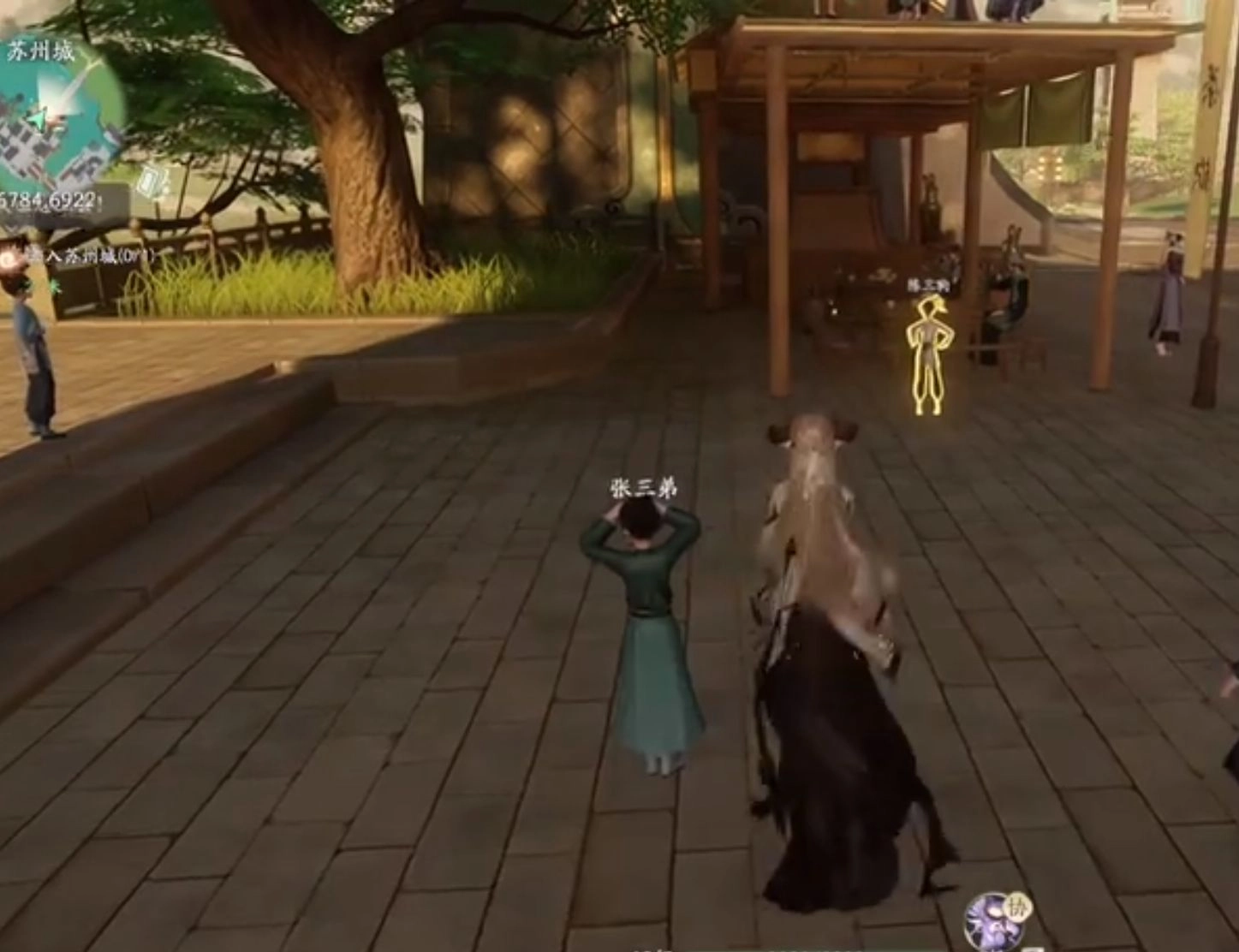 首先来到苏州城,小朋友,这属于支线任务,是在主线任务中途要帮的忙。拱形大门旁边有个房屋的小平台,下面由几根柱子支撑着,上面已经有几个小孩了。我们得把下面的小孩都送到屋顶上去。NPC陈三*这个小孩,正常情况下,我们走到他身旁,用御物的方式将他托举起来,举过头顶,然后把视角往上抬,左右和上下稍微移动一下,就能找到空位把他放上去。