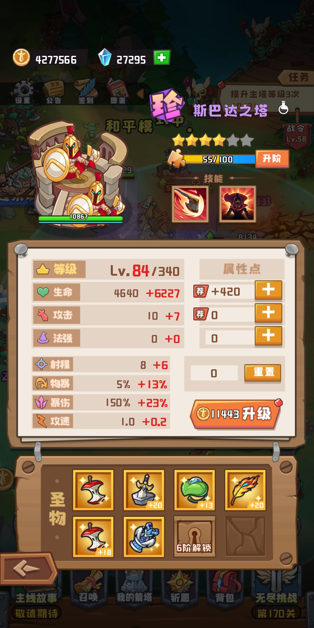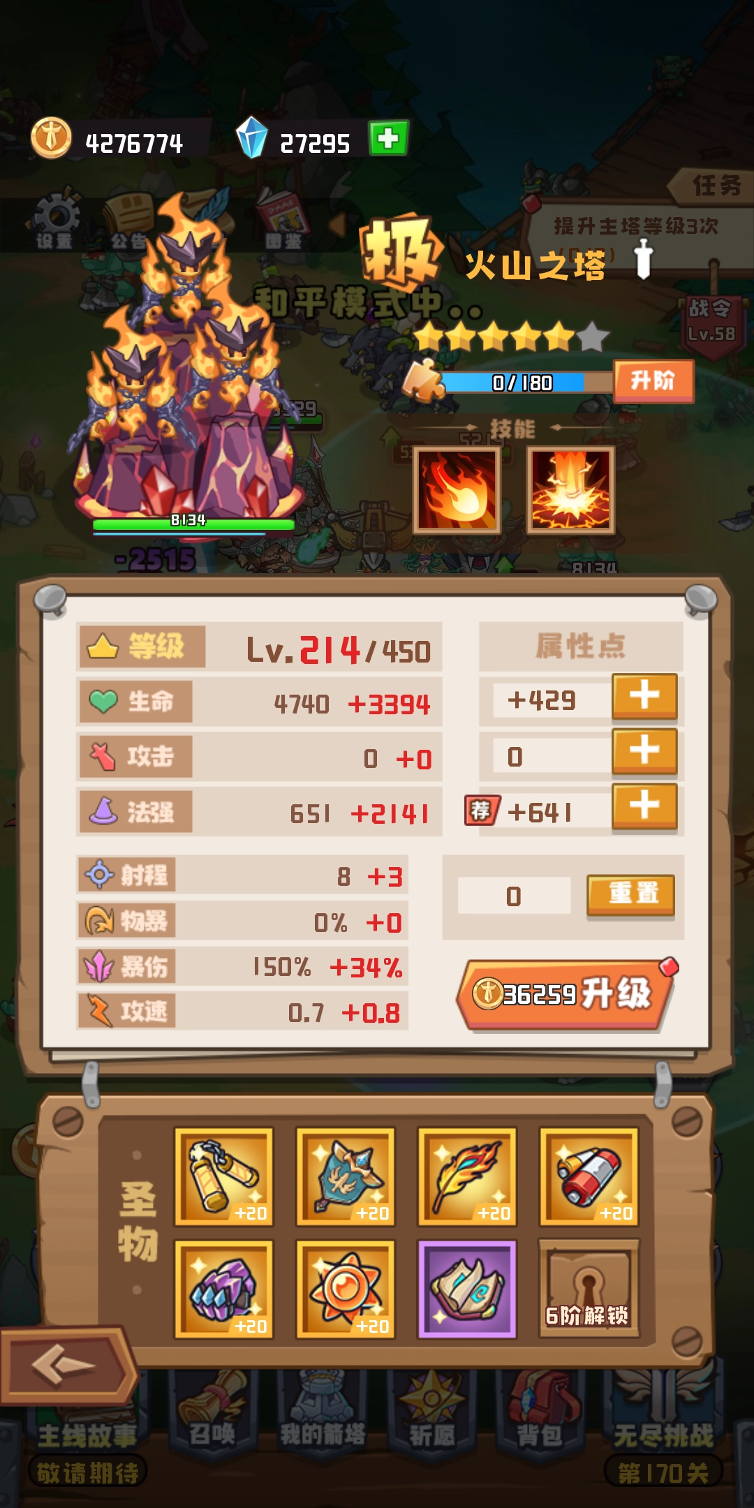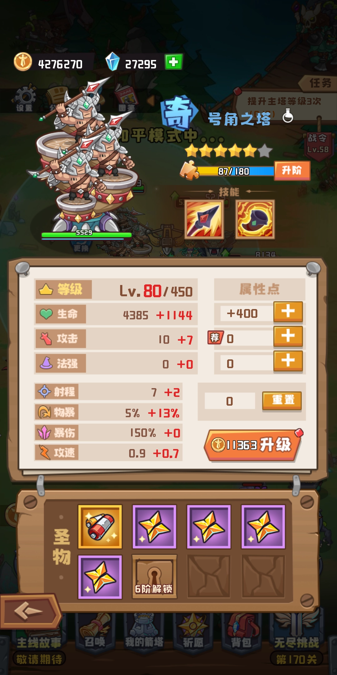 对于号角和祭祀,我着实纠结了好一阵子。毕竟号角只是个蓝色品质,但它的充能效果相当靠谱,三个满级星星能带来70%的增伤,差不多等同于常驻增益了。而祭祀的攻速加成,巨龙塔享受不到,对主塔的效果也不显著,仅仅对火山有用。并且,它的爆伤加成不像号角那般直观,号角一旦触发,就如同三本魔法书带来的提升。