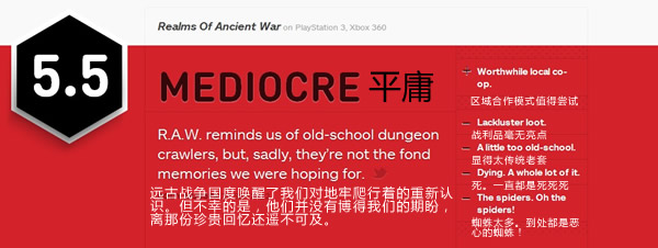 除了贪婪无比的地牢爬行者大军外,游戏也反映出了很多问题,必须全部加以改善。这款游戏似乎让人感觉是在复古,有宁缺毋滥之势。但由于特点缺失,设计糟糕,战利品毫无“刷”点,都足以成为您舍弃《远古战争国度(R.A.W)》的理由。