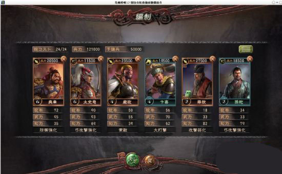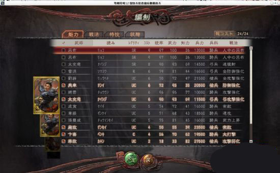在第二张图的右上角,能看到一个标注为【总COST】的数值,这是对玩家选用武将的一项限制条件——出击武将的总COST值之和不得高于24,且部队最多可派出6支。
