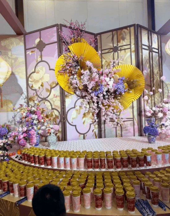现场处处是盛放的鲜花,宛如一片绚烂花海,还专门设置了霸王茶姬的饮品展台。每位宾客都手持一杯该品牌的奶茶,其中不乏“伯牙绝弦”这样的爆款单品。